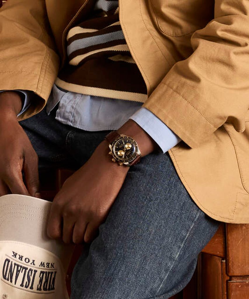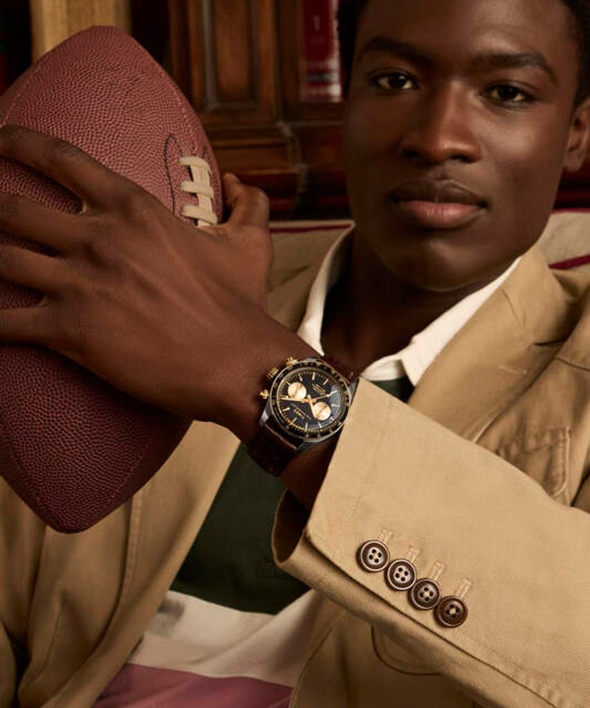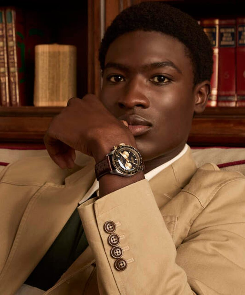 A combination of polished and brushed finishes are applied to the 39mm stainless steel case. The black dial serves as a backdrop for the elegant slender hands with luminescence. The sub-dials, lunette and crowns are an elegant feature, with a gold finish. All protected by a hardened mineral glass.