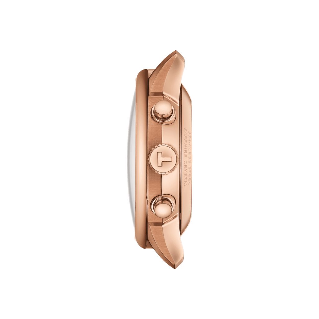 The Tissot T1394623629800 watch has a case made of stainless steel in a rose gold PVD finish, which is complemented by a brown leather strap. Inside, the ETA Valjoux A05.231 Swiss mechanical movement with automatic winding works reliably, based on the Valjoux 7753. The movement has a power reserve of up to 68 hours, operates at a frequency of 4 Hz (28,800 oscillations per hour) and has 29 stone settings. The machine has a stopwatch function , hacking and a manual winding option. The flywheel of this movement is made of Nivachron alloy, which is more resistant to magnetic field and temperature changes and results in better watch accuracy.