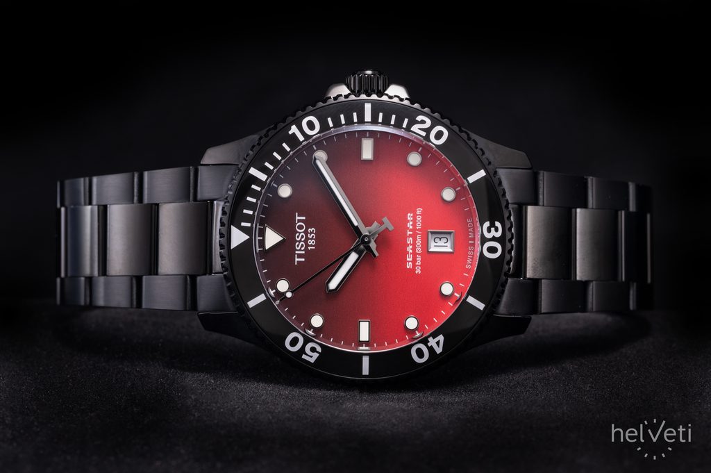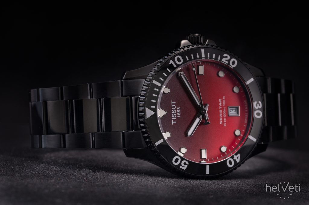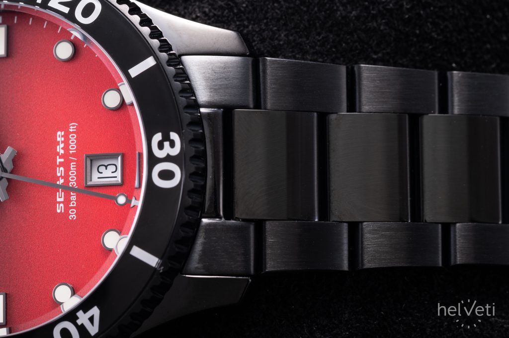 The watch is made with a combination of steel case and steel bracelet in PVD black finish. The red-black dial is protected by a sapphire crystal with a double-sided anti-reflective coating, which is highly resistant to scratches.
