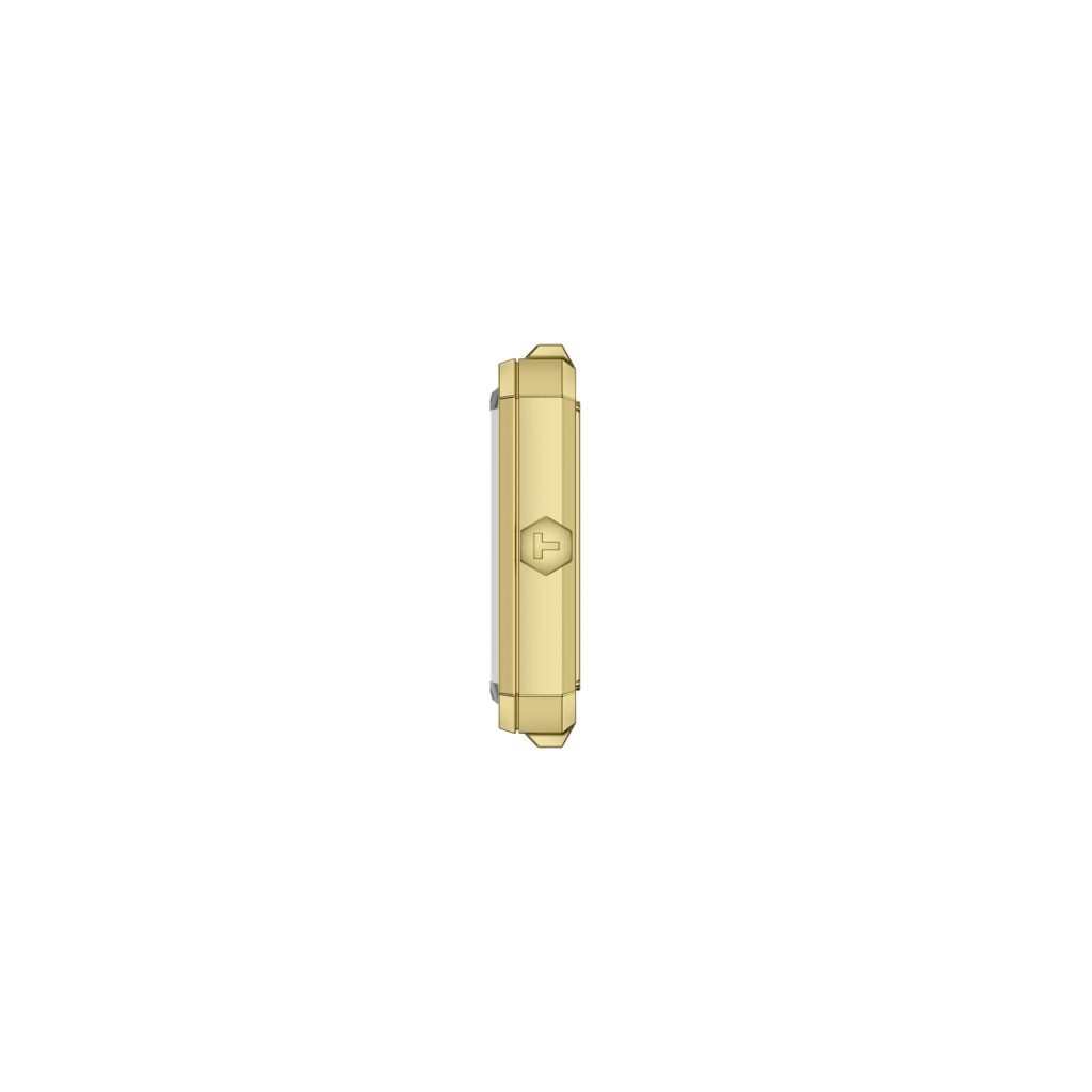 The rectangle-shaped case is made of stainless steel, which is complemented by a bracelet made of the same material. Both the case and the bracelet are finished in yellow gold PVD. The crown in the shape of a hexagon with the brand's logo is also a characteristic feature of the case. The clean and elegantly designed dial in yellow with a sunburst effect is protected by a sapphire crystal that is highly scratch-resistant.