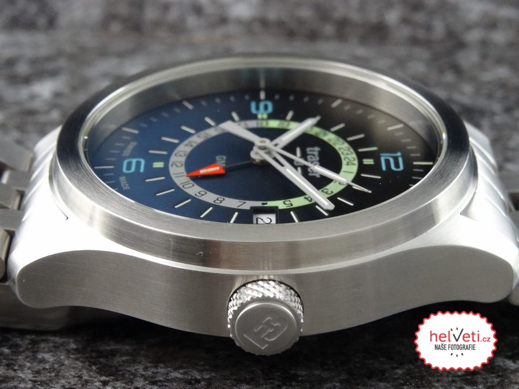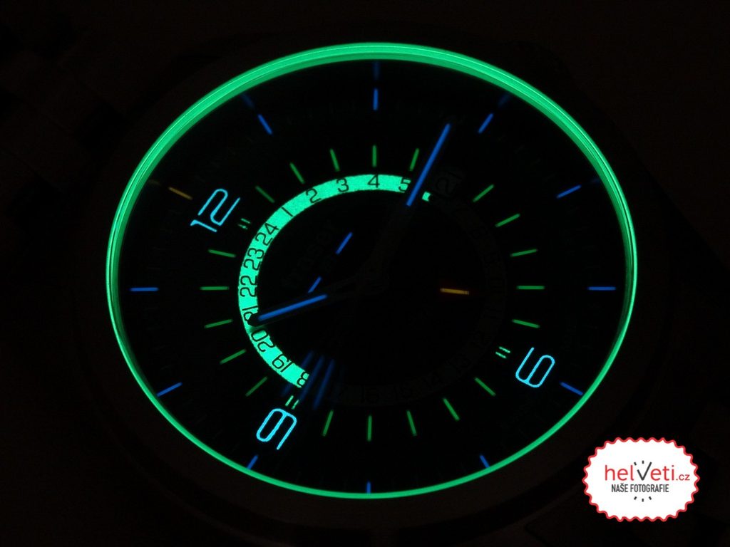 Luminescence info SuperLuminova – digits 6, 9, 12 and the top of the GMT scale, Trigalight – hands, indexes, GMT scale indexes