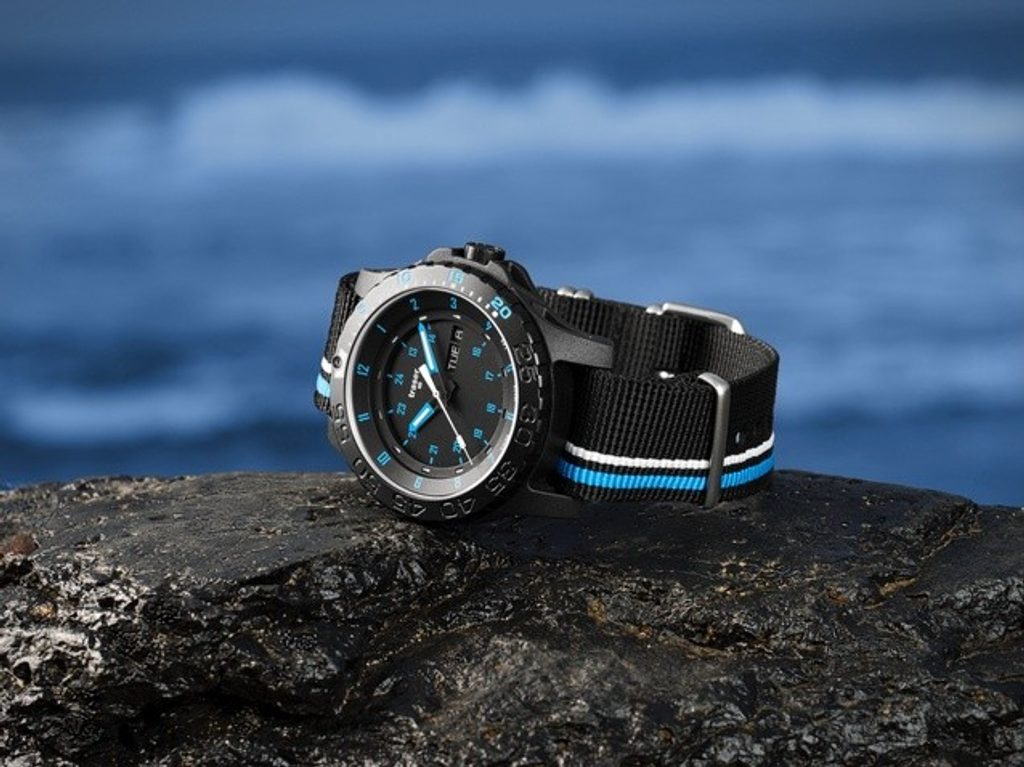 New for 2015, the Traser Blue Infinity expands the very popular Tactical line. The watch, like the other models in this series, is suitable for the most demanding environments. Due to the double construction of the case, where the inner steel part is covered by a plastic part reinforced with fiberglass, it has increased resistance to mechanical damage. Other quality features such as the sapphire crystal, high water resistance (200m), screw-down crown, and two-way rotating lunette make the watch a great partner for all occasions. Thanks to the Trigalight technology, the hands and indices glow in the dark, icy blue.