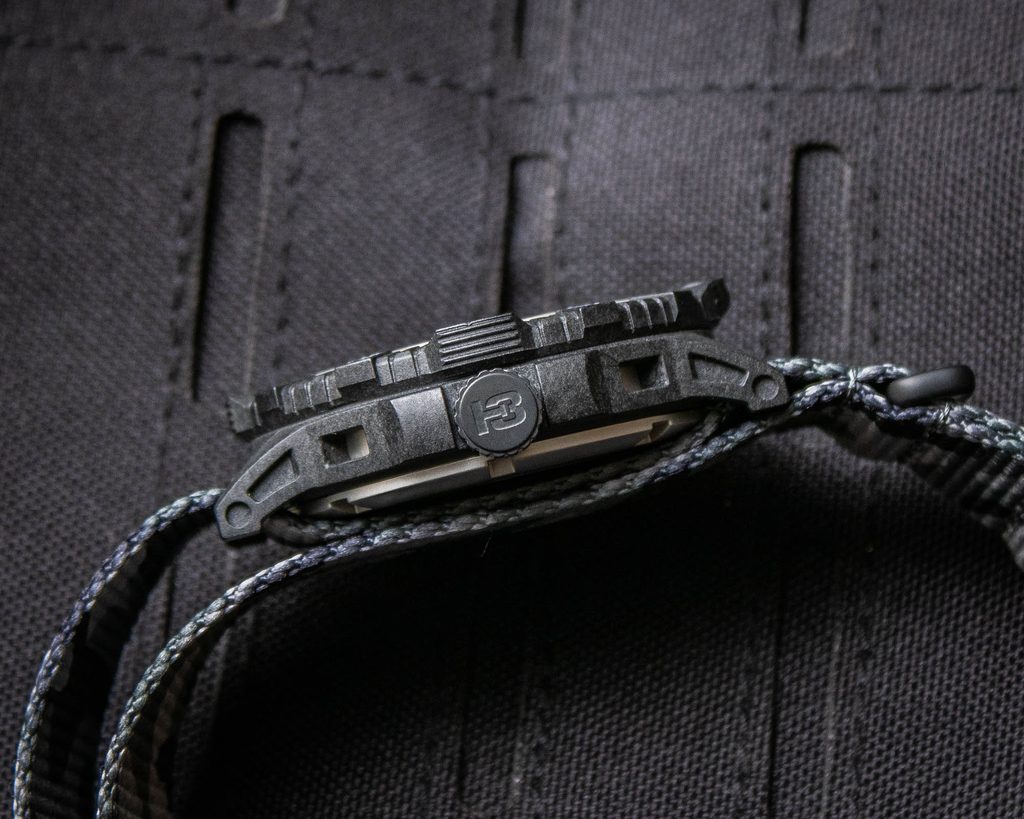 In order to protect the watch's precision mechanics from strong shocks and shocks, the P99 A Tactical is equipped with a special case construction: a carbon fibre-reinforced polymer surrounds the inner steel case as an additional protective layer. Screw-down crown, sapphire crystal and an anti-reflective layer that is scratch-resistant. With a water resistance of up to 200 meters, the watch can also be used when swimming, snorkeling or diving. Finally, the transparent case back offers a view of the automatic movement that powers the watch.