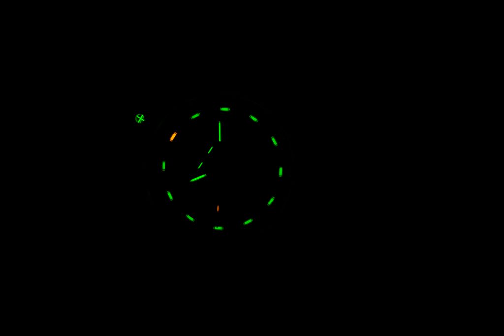 Of course, the watch has an anti-reflective sapphire crystal. This provides not only the traditional scratch resistance but also the necessary legibility in bright sunlight. The hands and indices are fitted with tubes with Trigalight technology, which ensures readability in the dark, without any illumination, for up to 15 years. SuperLuminova technology is applied to the glass and crown seals. The hallmark of this watch is the luminescent cross on the lunette at the "12" position. With a water resistance of up to 200 meters, the watch can also be used when swimming, snorkeling or diving. A screw-down crown ensures a better seal of the case.