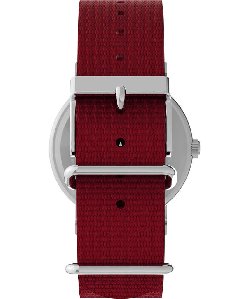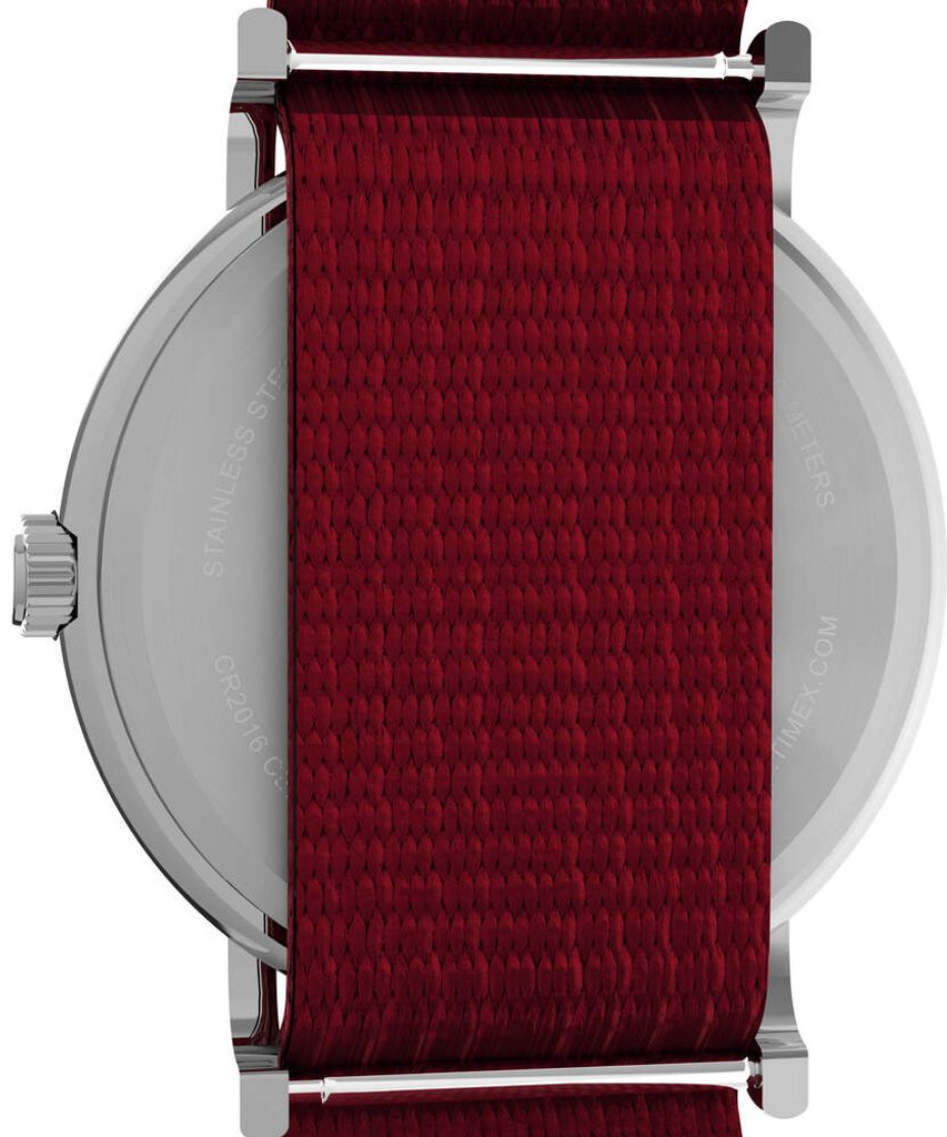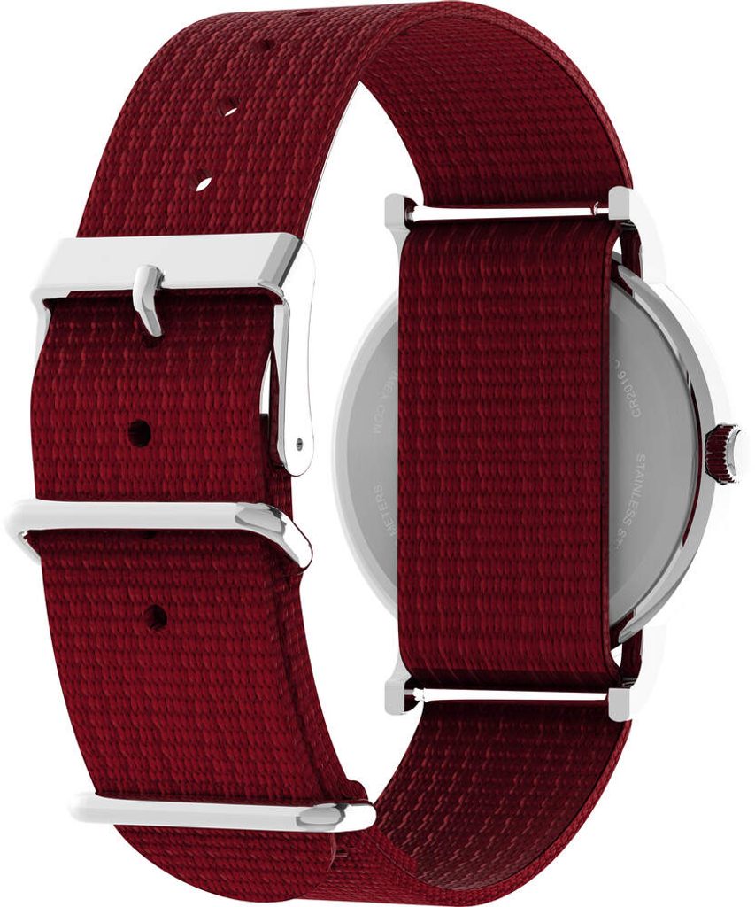 The battery-powered quartz watch has a water resistance of 30 m ( 3 ATM), so it can handle basic contact with water when washing hands or in the rain. The model features a red nato strap with a width of 20 mm.