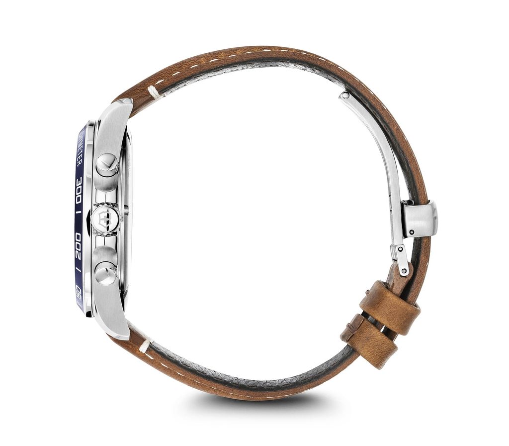 The watch case is made of stainless steel, the strap is leather. The crown is protected against unwanted manipulation by a protruding case. On the lunette there is a tachymeter. The elegantly designed dial is protected by a sapphire crystal with anti-reflective coating, which is highly resistant to scratches. The watch is reliably waterproof during swimming and diving to a depth of approx. 10-30 metres (water resistance 100 m).