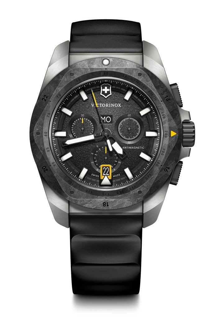 Swiss Victorinox watch from the I.N.O.X. model series with the Victorinox I.N.O.X. marking. Chrono 241988.1 - Set - a novelty for 2023 that will last a lot. Titanium case with carbon lunette, screw-down crown, anti-reflective sapphire crystal, Ronda 5040 movement.E, hands and indices with SuperLuminova luminescent coating, a strap made of durable leather with imitation wood and a second one in the package made of rubber with quick-release fasteners for easy replacement at home and water resistance to 200 metres - these are the features behind the incredible durability.