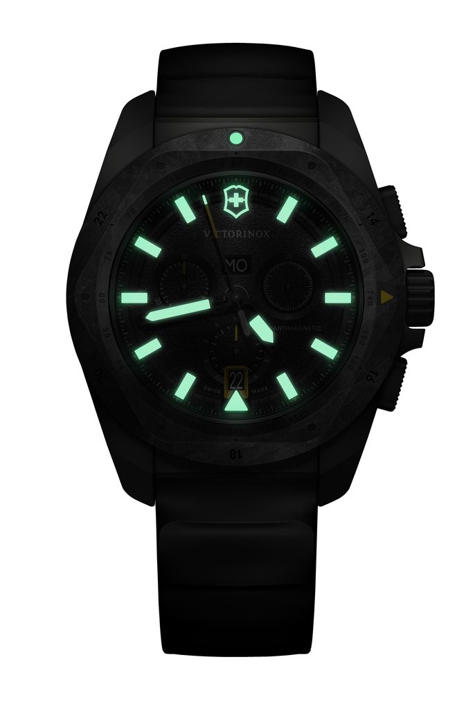 Swiss Victorinox watch from the I.N.O.X. model series with the Victorinox I.N.O.X. marking. Chrono 242011 - a novelty of 2023, which will last a lot. A titanium case with carbon lunette, screw-down crown, anti-reflective sapphire crystal, Ronda 5040.E movement, hands and indices with SuperLuminova luminescent coating, a strap made of durable rubber with quick-release buckles for easy replacement in domestic conditions and water resistance to 200 metres - these are the features behind the incredible durability.