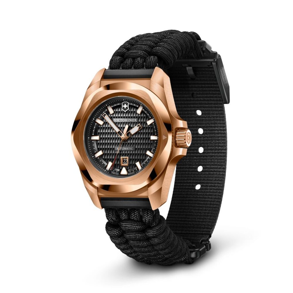 In 2025, the I.N.O.X. range finally expands to include women's models with automatic drive. The Victorinox women's Swiss watch from the I.N.O.X. model series, model number 242025.1, features a steel case with rose-gold PVD finish, anti-reflective sapphire crystal, hands and indices with SuperLuminova luminescent coating . The watch is powered by a Sellita SW100 movement with a date display located at 6 o'clock and a power reserve of 42 hours. The strap, which turns into a 2m long rope when untangled. Just take the watch off your wrist, untangle the rope and you can use it for whatever you want. Waterproof to 100 metres - these are the features behind the incredible durability.