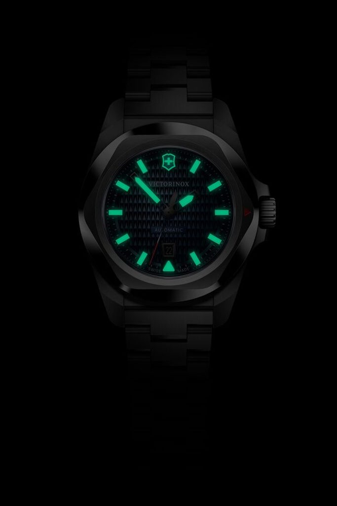 In 2025, the I.N.O.X. range finally expands to include women's models with automatic drive. The Victorinox women's Swiss watch from the I.N.O.X. model series, model number 242026, features a steel case, anti-reflective sapphire crystal, hands and indices with SuperLuminova luminescent coating . The watch is powered by a Sellita SW100 movement with a date display located at 6 o'clock and a power reserve of 42 hours.
