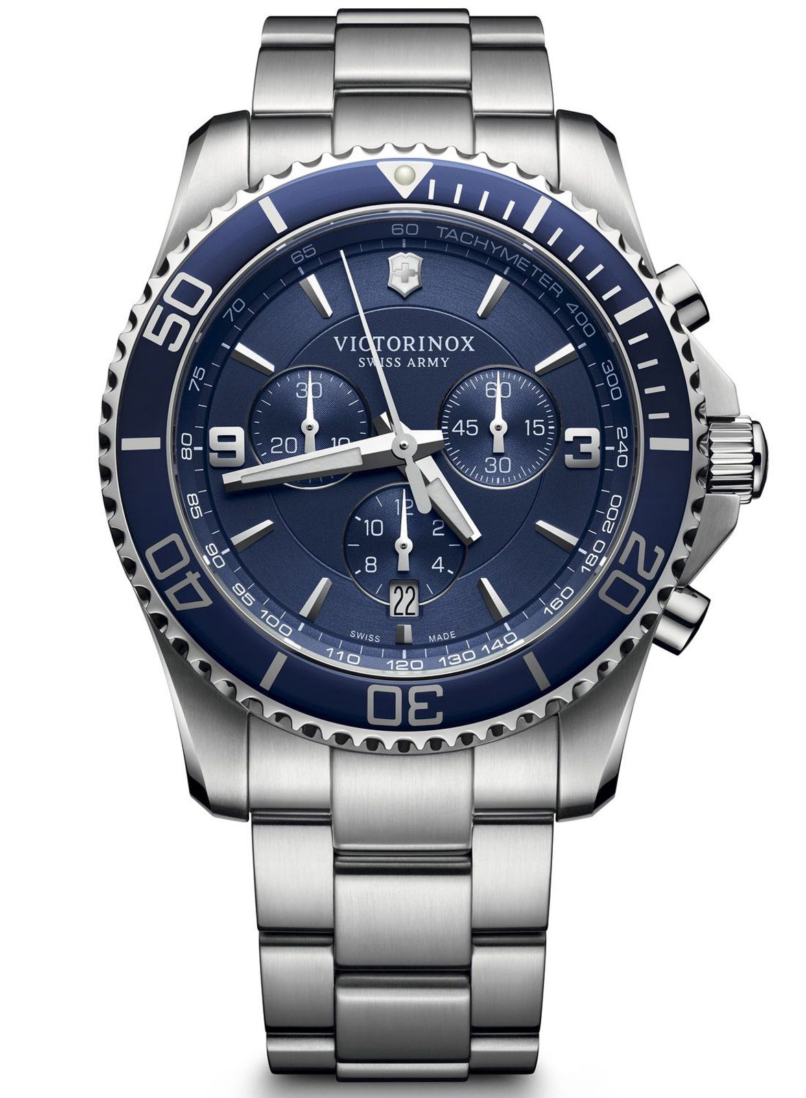 The Victorinox Swiss men's watch from the Maverick model series with the Chronograph 241689 has a round steel case, anti-reflective sapphire crystal, date display, stopwatch and rotating lunette.