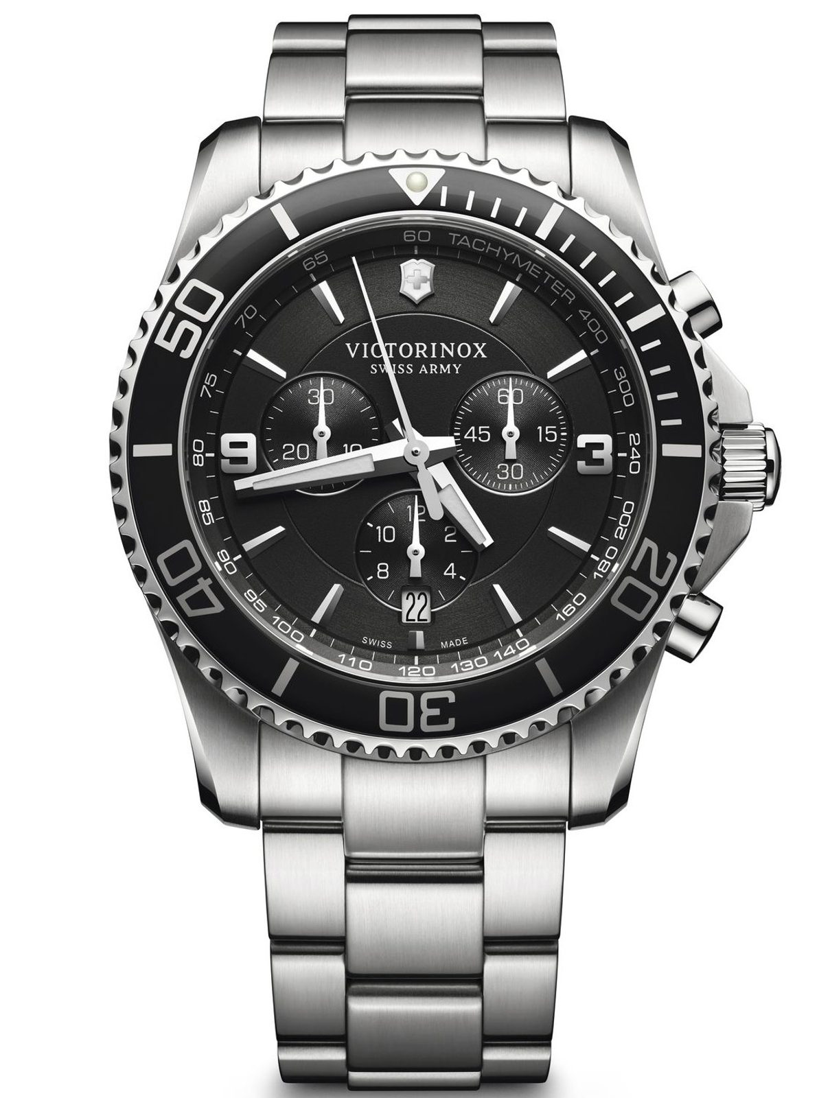 The Victorinox men's Swiss watch from the Maverick model series with the Chronograph 241695 has a round steel case, anti-reflective sapphire crystal, date display, stopwatch and rotating lunette.