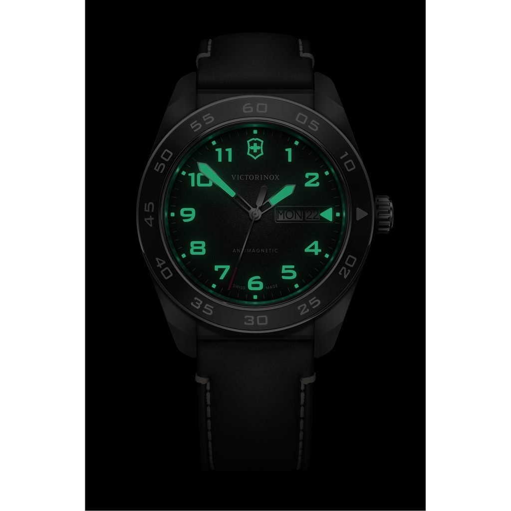 The Victorinox Swiss Army 242041 is powered by the Ronda 517 Swiss quartz movement, which features a date and day of the week display at the traditional 3 o'clock position. The hands and embossed numerals feature a rich coating of SuperLuminova.