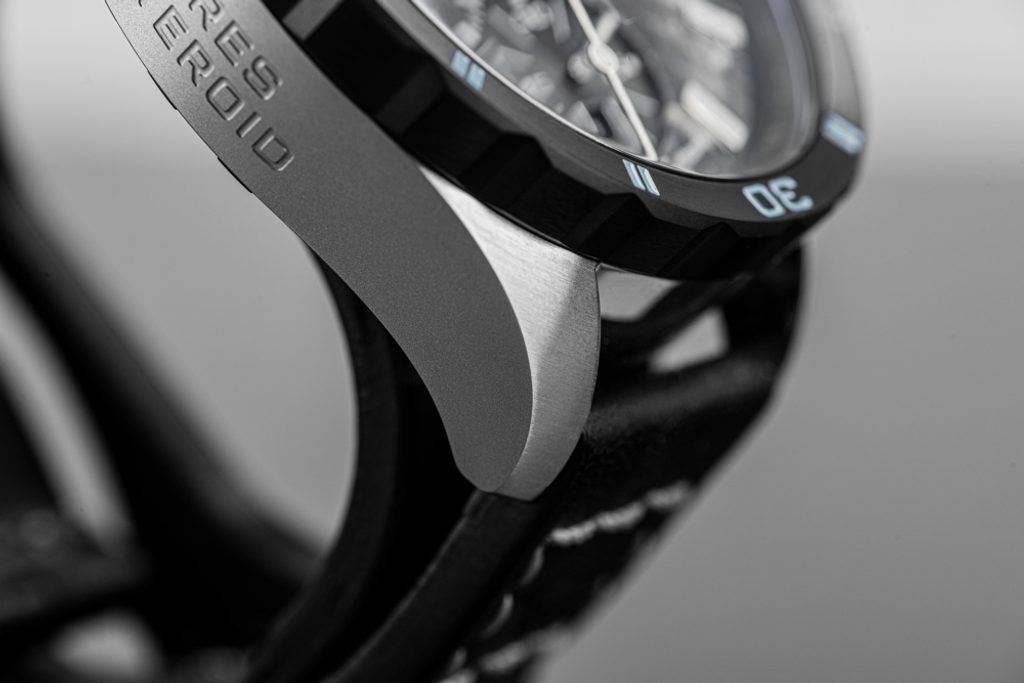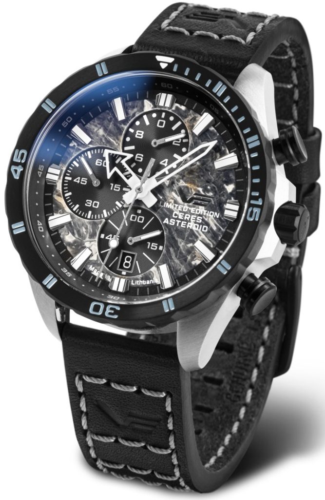 The case of the Vostok Europe Celestial Objects Ceres Asteroid 6S10-320E693 ismade of stainless steel with a black rotating lunette. Inside is a Japanese Miyota 6S10 battery movement . At the 6 position there is a handy date display and an off-centre seconds hand. The watch also features a stopwatch function with a minute counter at position 9.