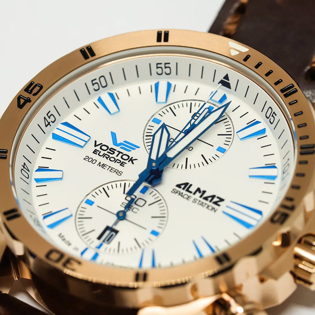 The case of the Vostok Europe Almaz Chrono Line 6S11-320B676 is made of stainless steel with a gold PVD finish. Inside is a Japanese Miyota 6S11 battery movement. The date display and off-center seconds hand share space at the 6 position. The central hand belongs to the stopwatch, as does the 60-minute counter at position 12.
