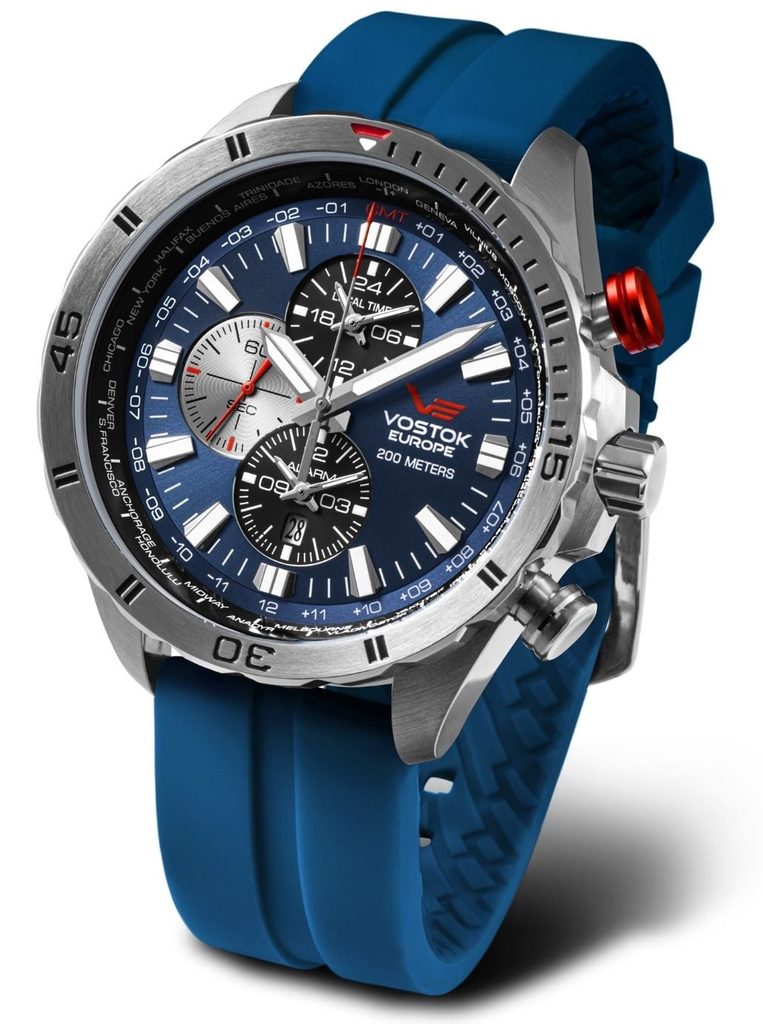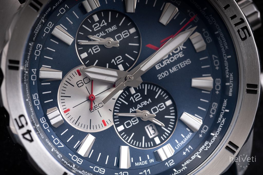 The case of the Vostok Europe Almaz Multifunctional Line YM26-320A652S Blue is made of 316L stainless steel. Inside is a Japanese S.Epson YM26 battery movement. At the 6 position is a handy date display along with an alarm. The sub-dial at position 12 displays the world time in 24-hour format. The central hand with red ending shows the current city in the second time zone. The off-centre seconds hand can be found at position 9.