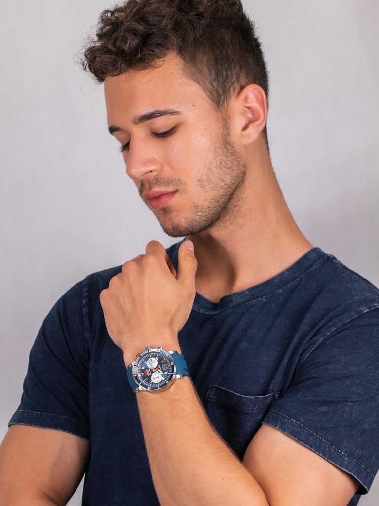 The water resistance of the Anchar Submarine Chrono Line 6S21/510A583 is set at 30 ATM and is supported by a screw-down crown. You can strap the watch to your wrist thanks to the silicone strap. A leather strap is also included.