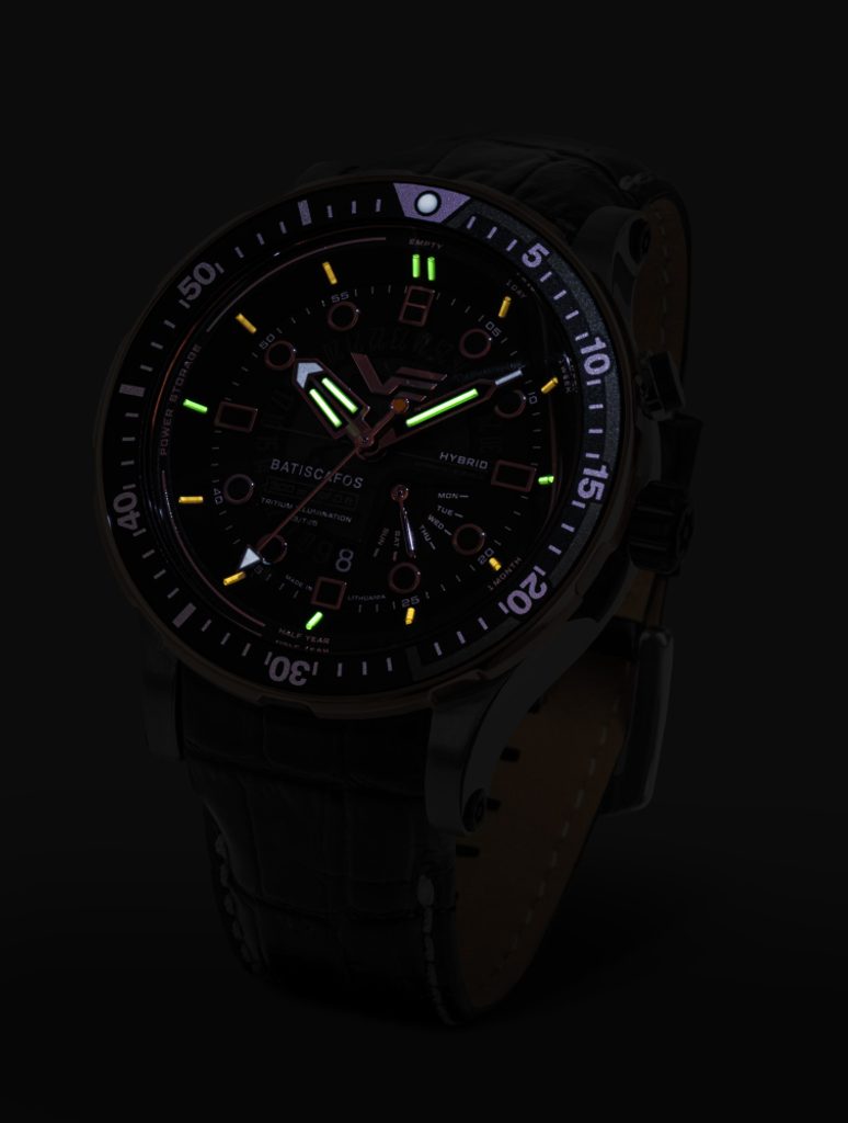 The semi-transparent dial is complemented by polished metal indices. For better readability during low light conditions, tritium capsules are above these indices, which will always give us a perfect overview of the time. Tritium capsules are also found on the hour and minute hands. At the 6 position, there is a handy date indicator. At position 5 we find a retrograde day of the week indicator. Everything is protected by a hardened K1 mineral crystal with internal anti-reflective treatment.
