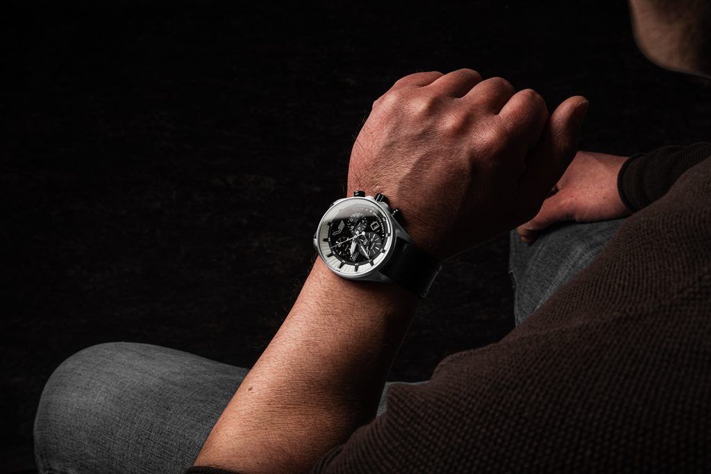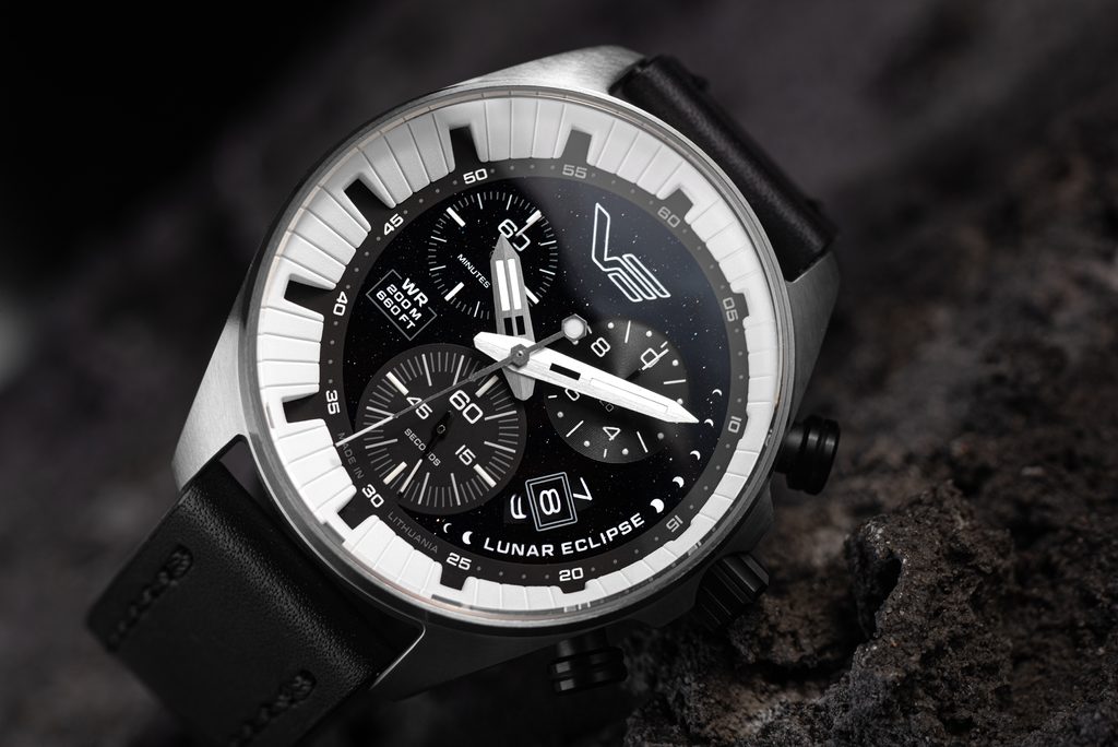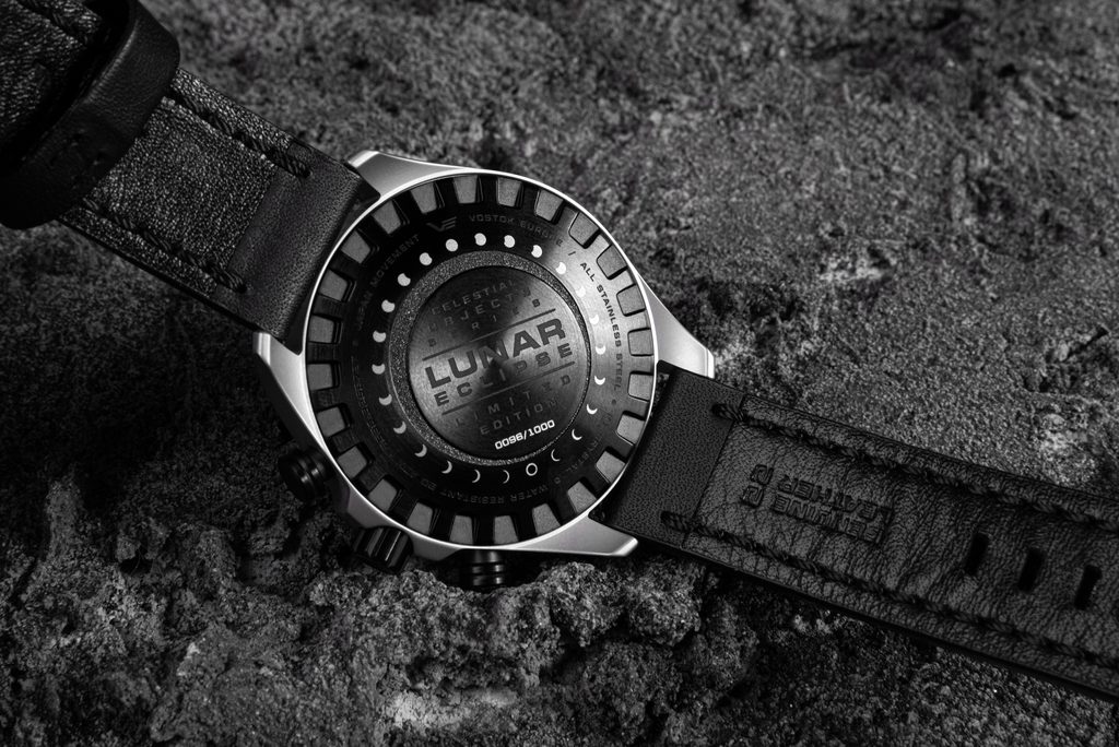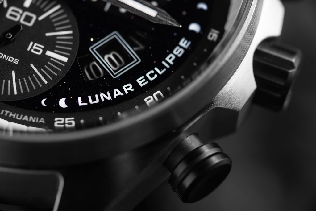 At the heart of this unique limited edition is the Japanese Miyota 6S30 Grand Chrono Quartz battery movement. It has practical functions such as a date display or a stopwatch. The hands and indices are painted with Superluminova luminescent coating for better legibility in low-light conditions. Another interesting feature is the matt white luminous ring with a moon structure, which creates a visual effect of a lunar eclipse in the dark. All protected by a domed K1 mineral crystal, the back of the watch features an engraving depicting the different phases of a total eclipse.