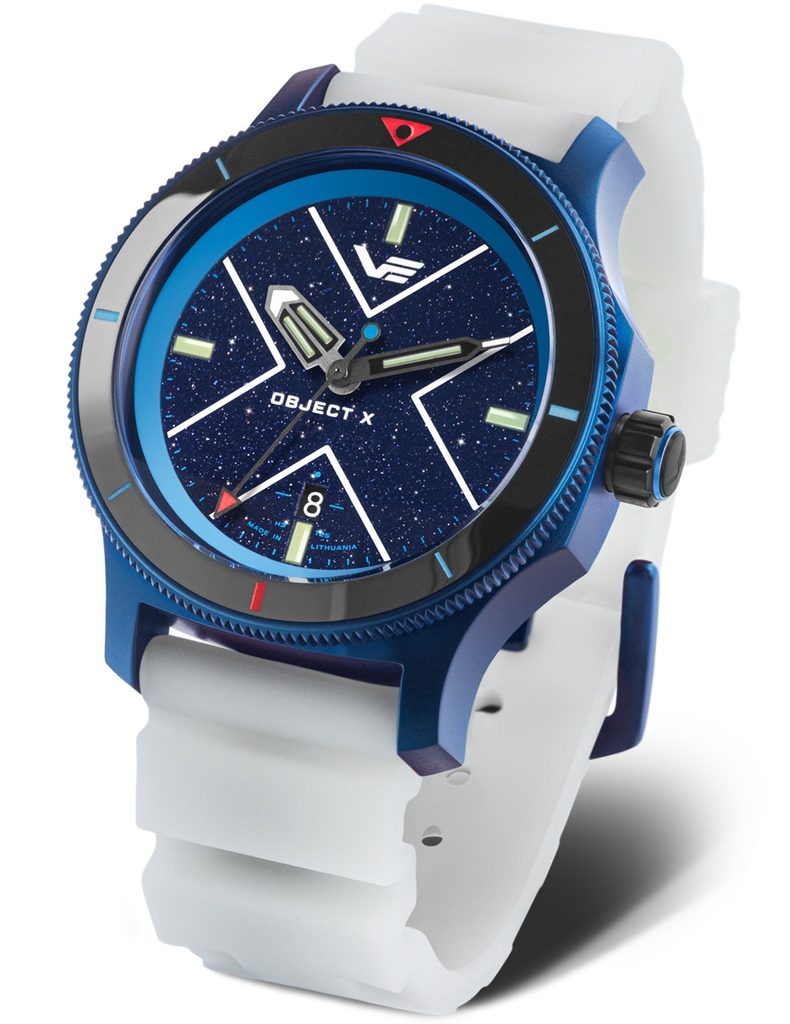 The dark blue aventurine dial with its huge luminous "X" and four massive tritium indices glitters like a marker in the cosmic "sky". Its shimmering particles evoke the silent glow of distant galaxies.