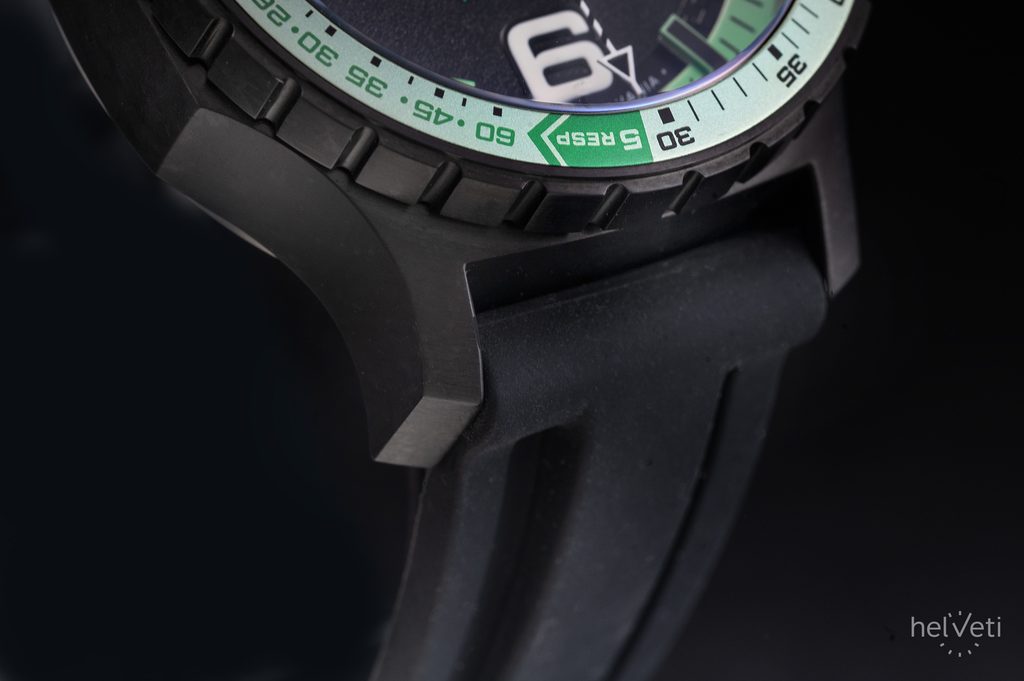 The case of the Vostok Europe Pulsometer Automatic Line YN55-597C731S is made of 316L stainless steel with a black PVD finish. Inside is a Japanese S. EPSON YN55 automatic movement with automatic winding and manual winding options. The movement is set with 22 jewels and has a power reserve of 40 hours. The Pulsometer Automatic models provide practical functions for checking basic health parameters - pulse and respiratory rate. The pulsometer scale is shown on a unidirectional rotating lunette.