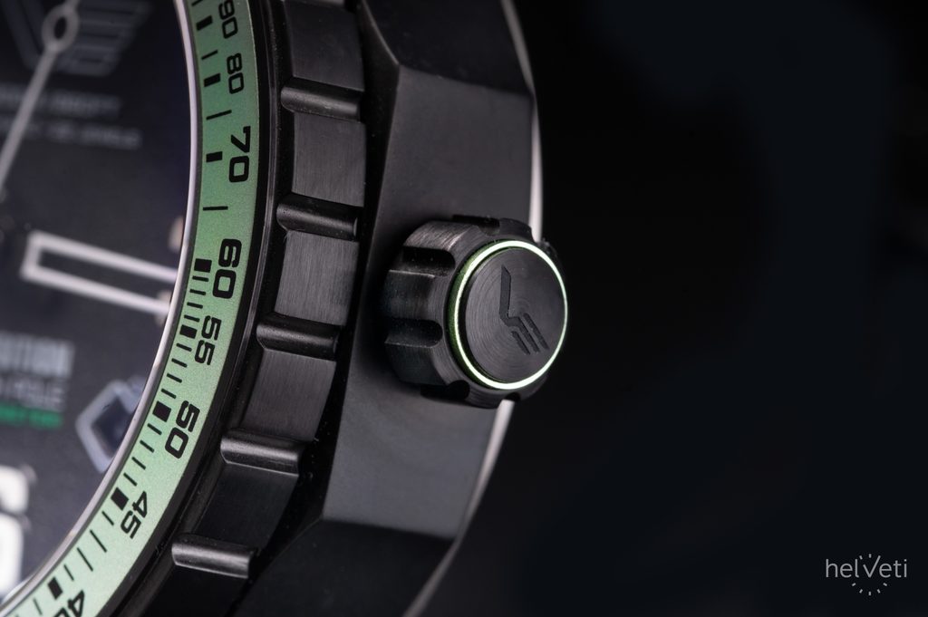 The dial is protected by K1 mineral tempered glass with an internal anti-reflective coating. Hands and indices are coated with Superluminova luminescent coating. The inner green lunette is also coated with this coating. The 47.3 mm case diameter makes it an ideal choice for fans of larger watches. The watch comes on a silicone strap with a spare leather strap with quick-change function.
