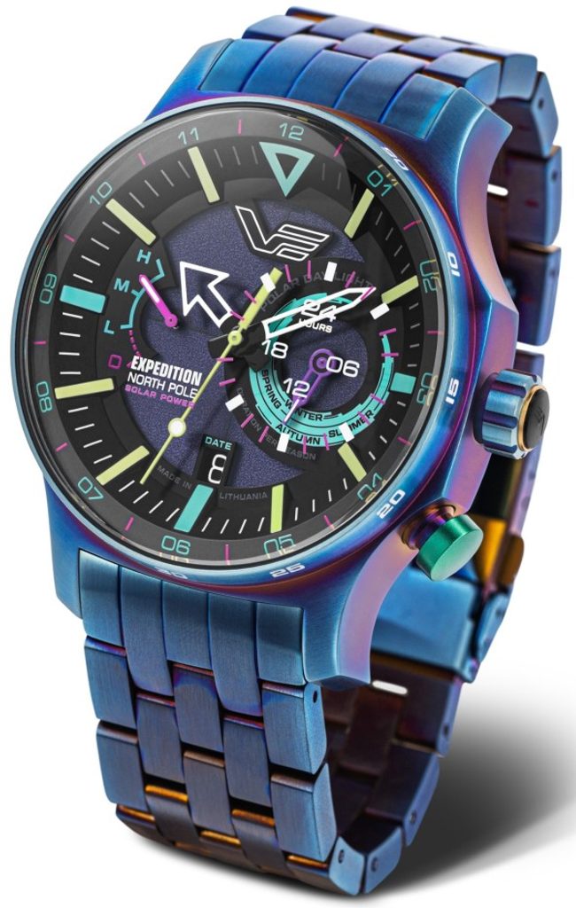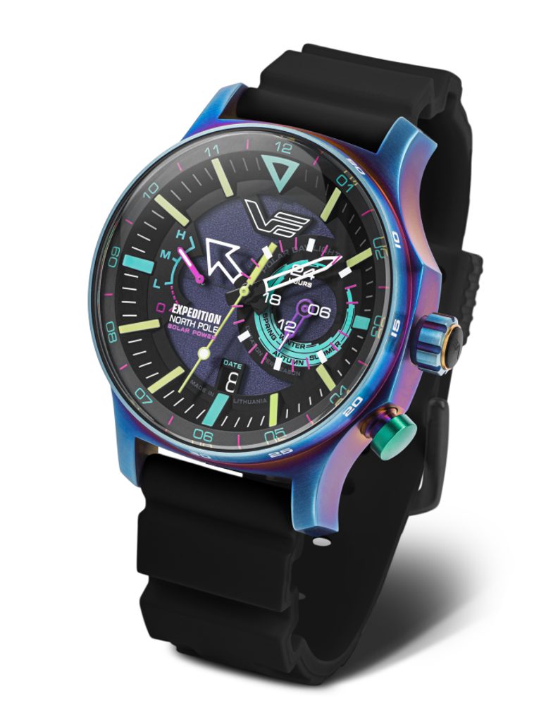 The Vostok Europe Expedition North Pole Solar Power 24h VS57-595D737B from the Expediton North Pole-1 model series refers to the first Soviet floating station on the ice floe. The station was in operation for nine months (274 days). The Kra, on which the station stood, travelled 2,850 km (1,000 mi) during this time and reached the east coast of Greenland.