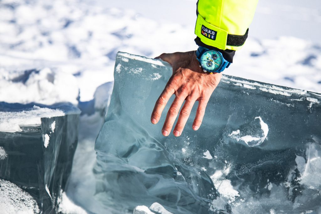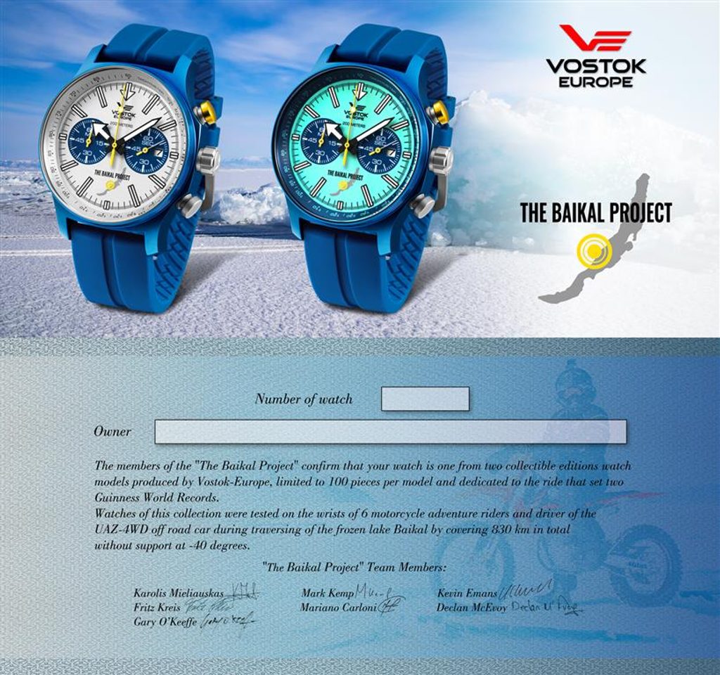 The watch was tested on the wrists of six motorcyclists and the driver of an off-road vehicle UAZ-4WD during a ride on the frozen Lake Baikal for a total of 830 km and at a temperature of -40°C.