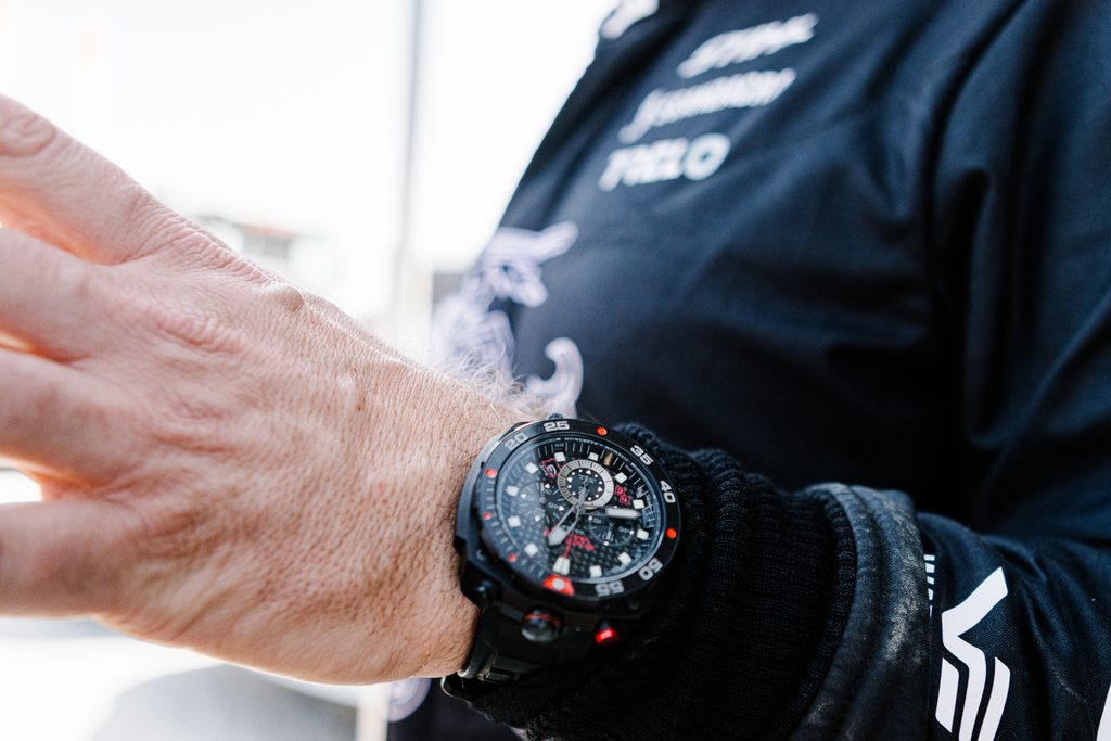 The K1 crystal with an anti-reflective coating ensures durability, while the 200-metre water resistance makes the watch suitable for both desert racing and underwater use. The ergonomic asymmetrical shape of the case back ensures the watch is as comfortable as possible to wear. The SuperLuminova luminescent coating on the hands and indexes ensures excellent visibility even in low light or at night, a "must-have" feature for endurance racing.