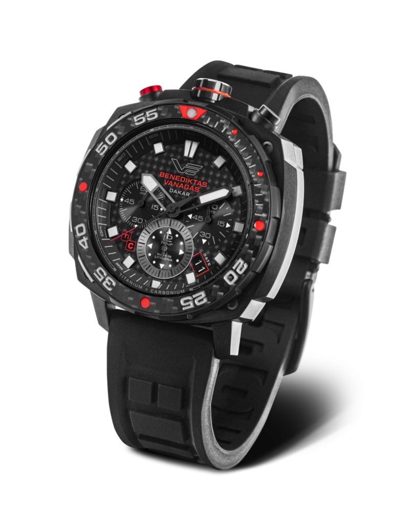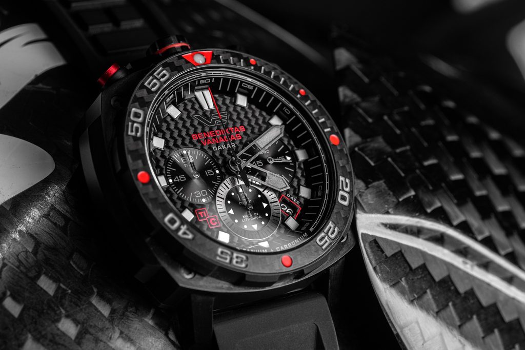 The Benediktas Vanagas Dakar Edition men's watch has a special "Bullhead" case made of titanium with a black PVD finish. The multi-layered dial and unidirectional lunette are made of carbon. The mecha-quartz chronograph pushers are unconventionally placed on the top of the case, not on the side.