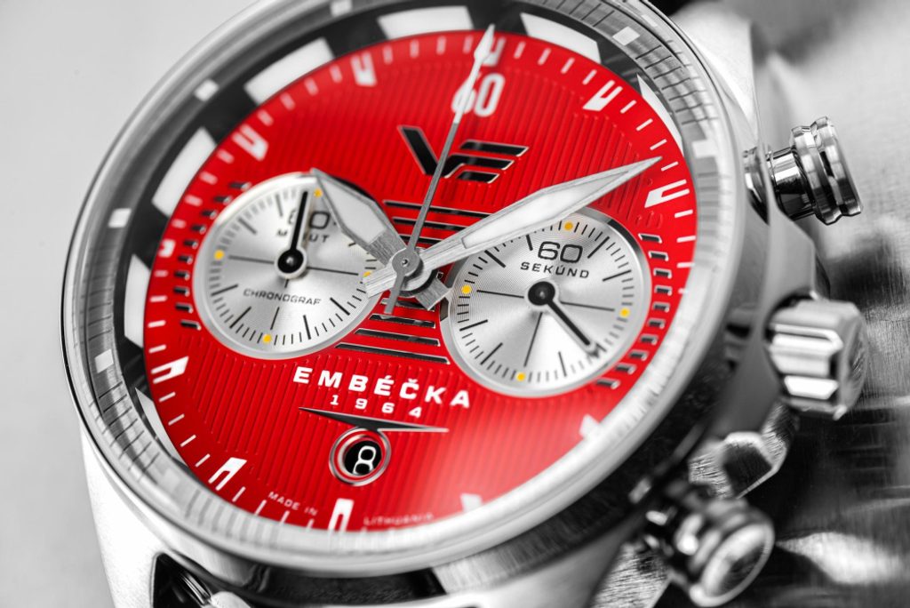 The case of the watch from the Embéčka edition is made of stainless steel. Inside is a Japanese Miyota 6S21 battery-powered movement with a practical date display and a stopwatch. The inner lunette and hands are luminescent for better legibility in low light conditions. Everything is protected by a K1 mineral glass with an internal anti-reflective treatment.