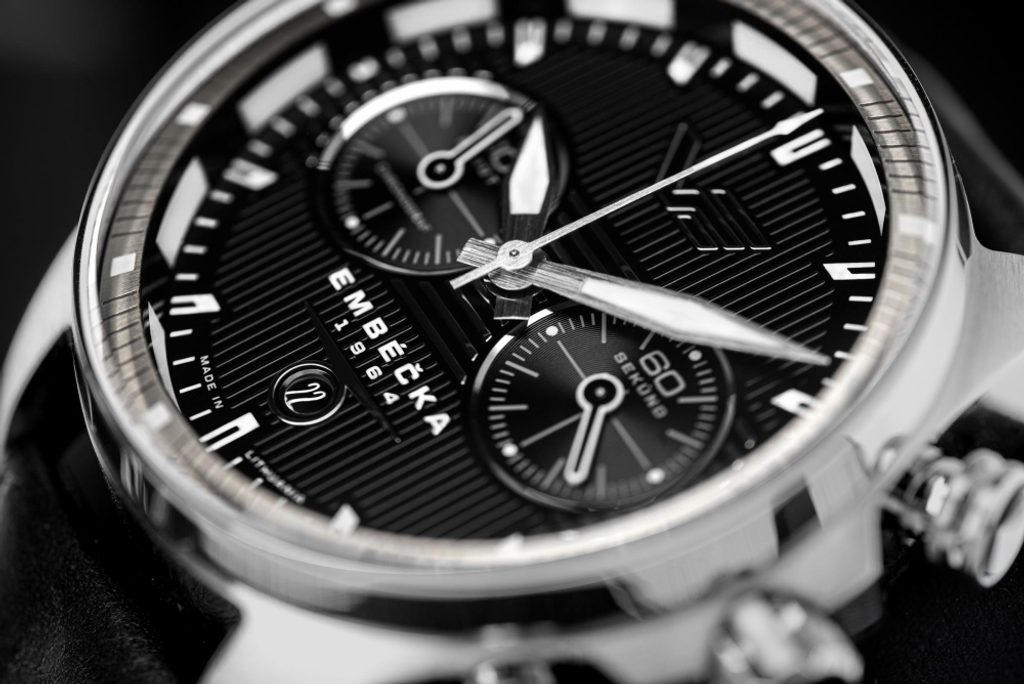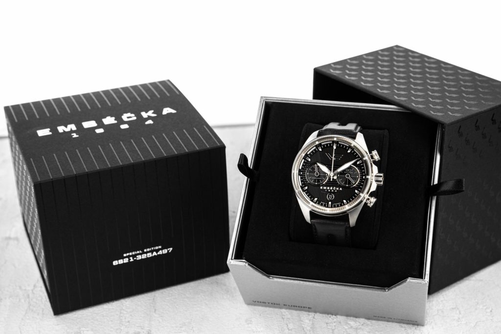 The case of the watch from the Embéčka edition is made of stainless steel. Inside is a Japanese Miyota 6S21 battery-powered movement with a practical date display and a stopwatch. The inner lunette and hands are luminescent for better legibility in low light conditions. Everything is protected by a K1 mineral glass with an internal anti-reflective treatment.