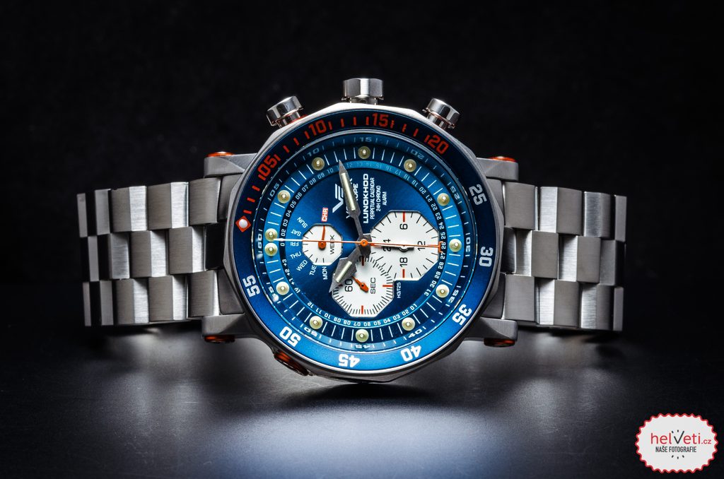 The case of the Vostok Europe Lunochod-2 Multifuncional Line YM86/620A636B is made of 316L stainless steel. Inside is a battery-powered Japanese S.EPSON YM86 movement. The sub-dial at position 12 displays the current day of the week. The central hand with a fork at the end serves as an indicator of the current day of the month. The numeric scale on the main dial is divided into three sectors: at the 0-36 minute position is the days of the month sector, at the 38-52 minute position is the months sector and at the 54-58 minute position is the years sector (four-year cycle with leap year). The watch also has a stopwatch function, an alarm and a unidirectional rotating lunette. It also has a helium valve.