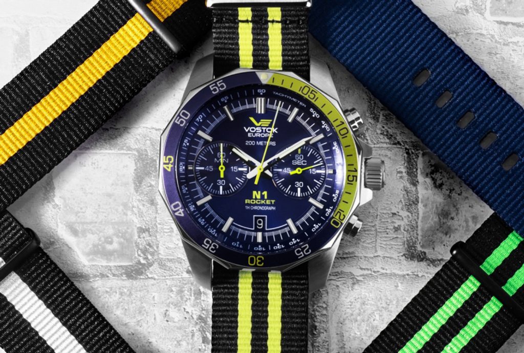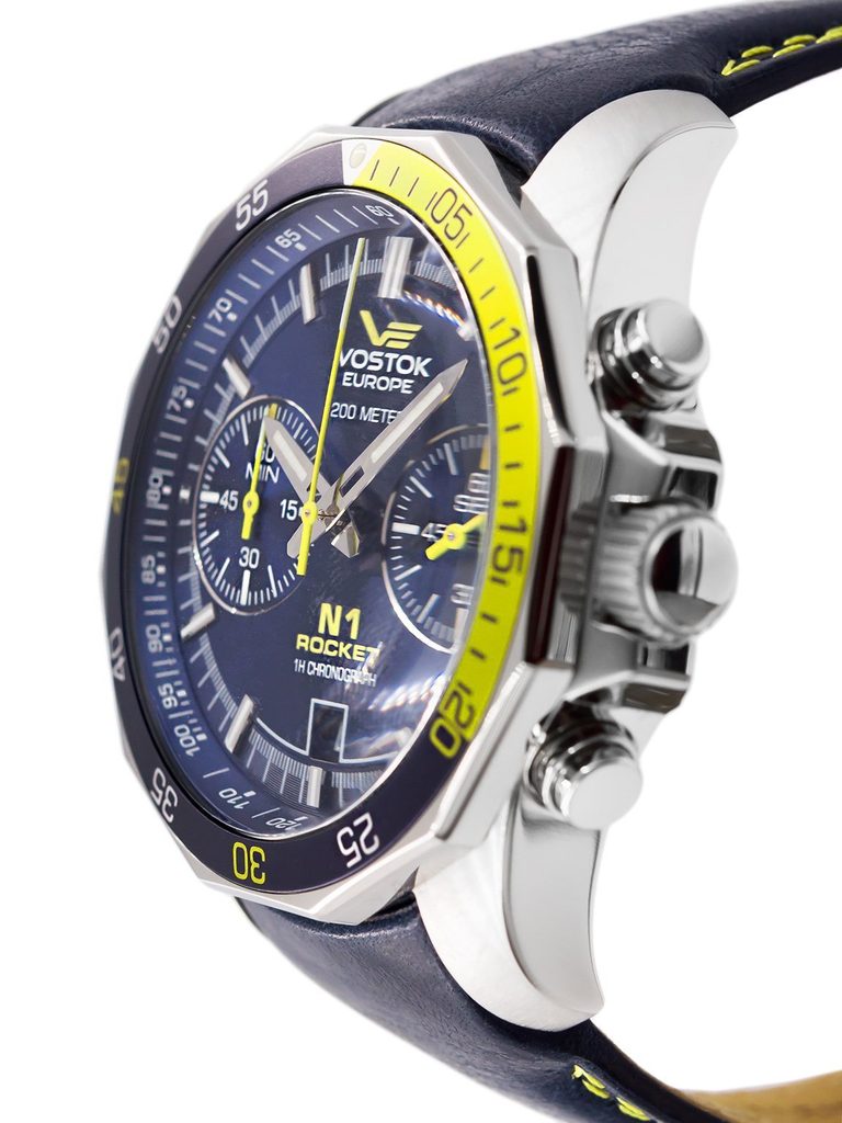 The case of the Vostok Europe N-1 Rocket Chrono Line 6S21/2255253 is made of 316L stainless steel. Inside is a battery-operated Japanese Miyota 6S21 movement. At the 6 position we find a handy date display. At position 3 is an off-centre seconds hand. The central hand belongs to the stopwatch, as does the minute counter at position 9.
