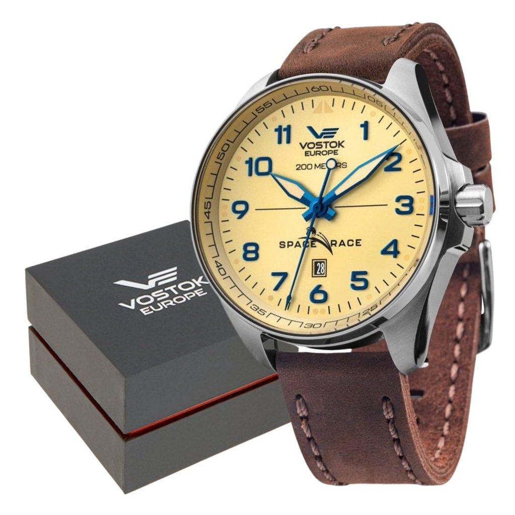 The Vostok Europe Space Race Automatic YN55-325A663 men's watch belongs to the Space Race model series. The USSR and the USA competed for supremacy in space flight. It began with the launch of an artificial satellite in 1957, continued with robotic space probes to the Moon, Venus and Mars, culminating in sending humans into Earth orbit and eventually to the Moon. The Apollo-Soyuz space mission of 1975 was a symbol of cooperation between the two sides and the end of the space race.