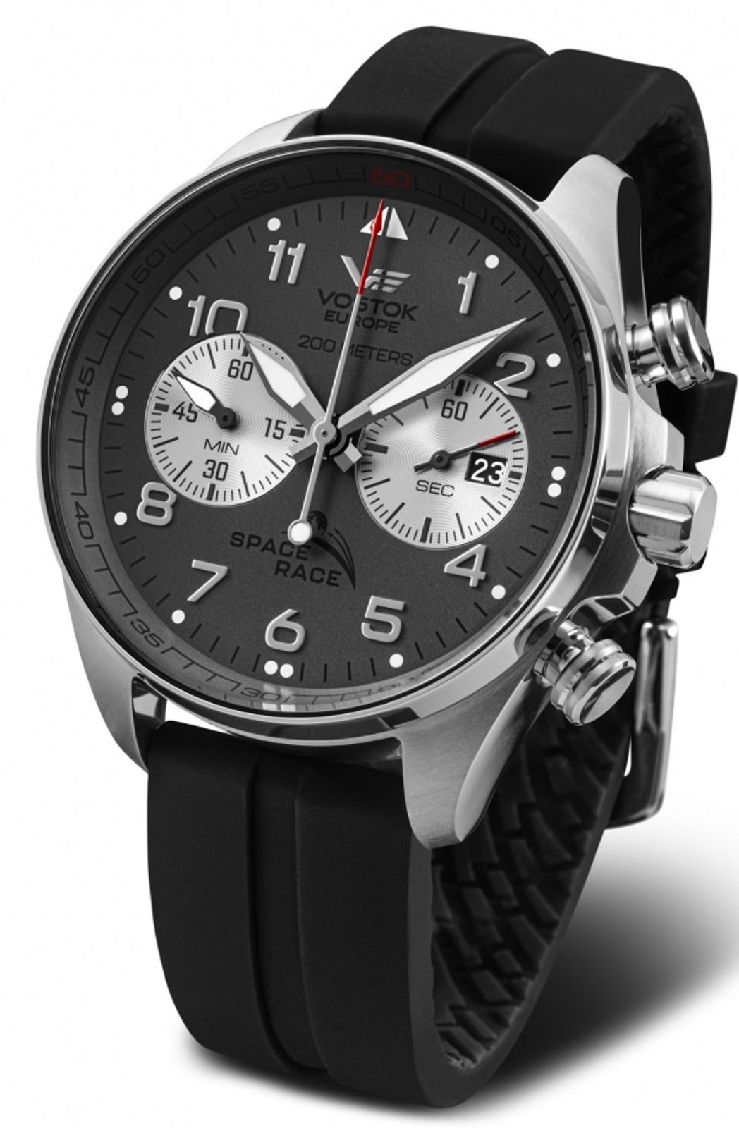 The Vostok Europe Space Race Chrono Line 6S21-325A666S men's watch belongs to the Space Race model series. The USSR and the USA competed for supremacy in space flight. It began with the launch of an artificial satellite in 1957, continued with robotic space probes to the Moon, Venus and Mars, culminating in sending humans into Earth orbit and eventually to the Moon. The Apollo-Soyuz space mission of 1975 was a symbol of cooperation between the two sides and the end of the space race.
