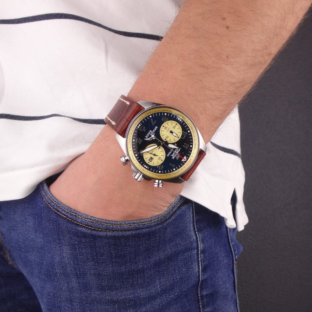 The case of the Vostok Europe Space Race Chrono Line 6S21-325A667 is made of 316L stainless steel and houses a Japanese Miyota 6S21 battery-powered movement, which has a stopwatch function and a practical date display. The dial is protected by a K1 mineral hardened glass with anti-reflective treatment. The hands are coated with Superluminova luminescent coating.