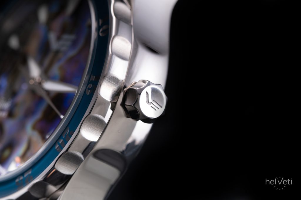 The dial, with a diameter of 39 mm, is made of genuine Abalone shell, which is known for its vivid iridescent colours and natural beauty. It is protected by a hardened K1 mineral glass with an internal anti-reflective treatment. With a water resistance of 200 m, the watch is suitable for swimming, diving or various water sports.
