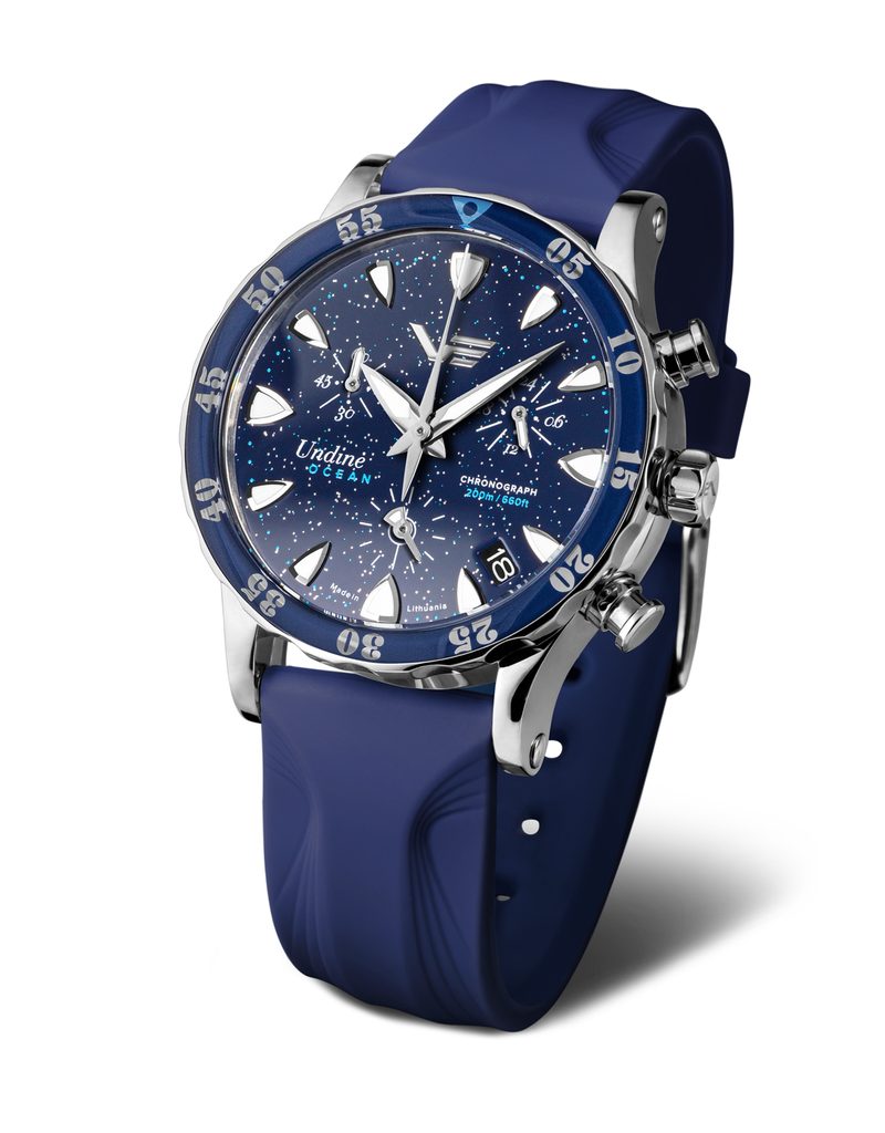The case of the Vostok Europe Undine Ocean VK68-515A756B watch is made of stainless steel. The watch is powered by a precise Japanese mecha-quartz VK68 movement with a central chronograph and small seconds hands. A handy date display is located at the 4.5 position.