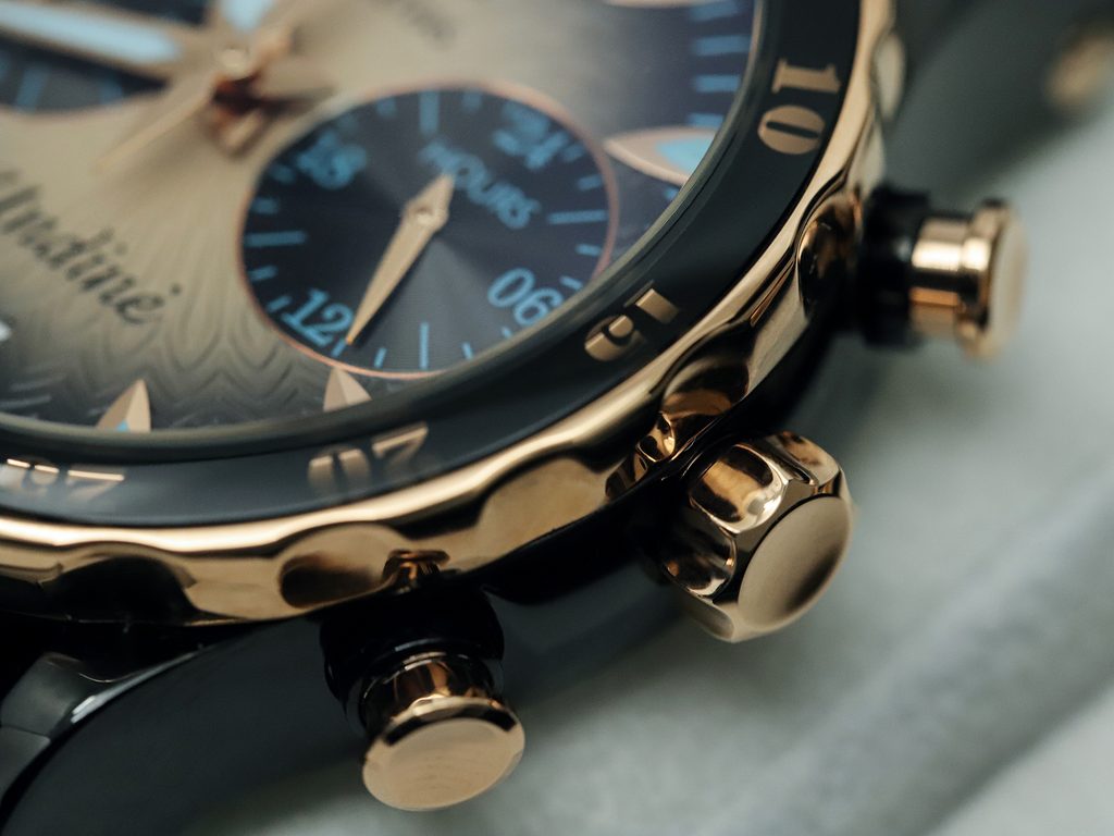 The case of the Vostok Europe Undine VK64-515E627 is made of stainless steel with black PVD finish and gold-plated lunette. Inside is a Japanese Seiko VK64 battery-operated movement. It has a stopwatch and date display. The sub-dial at the 3 position serves as a time display in 24-hour format. The dial is protected by a hardened K1 mineral crystal with anti-reflective treatment.