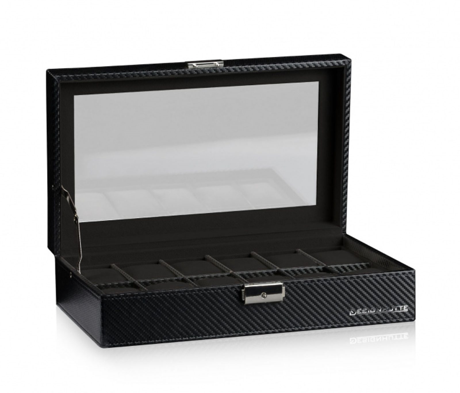 Elegant watch box Designhütte Boston 12 70005-185 for 12 watches with glass lid. Made of black synthetic leather with carbon pattern. The case is lockable.