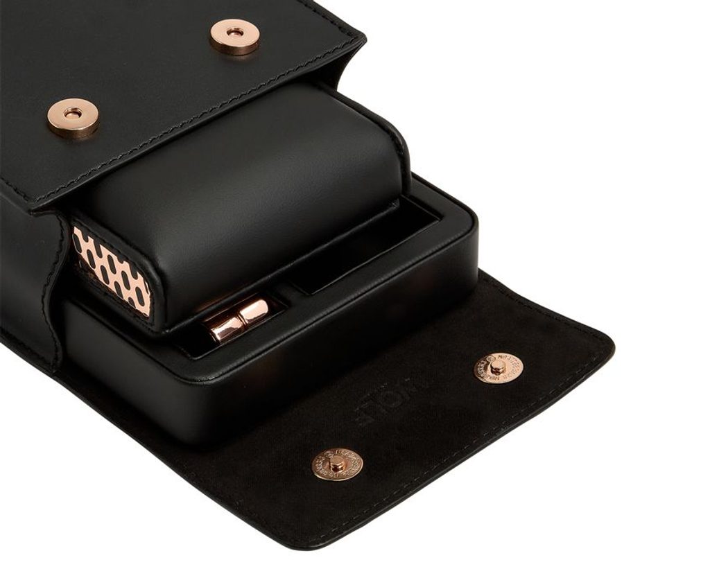 The secure base also includes a compartment for coins, rings or cufflinks, and a patented mechanism allows the watch stand to fold flat to fit comfortably in your travel luggage.