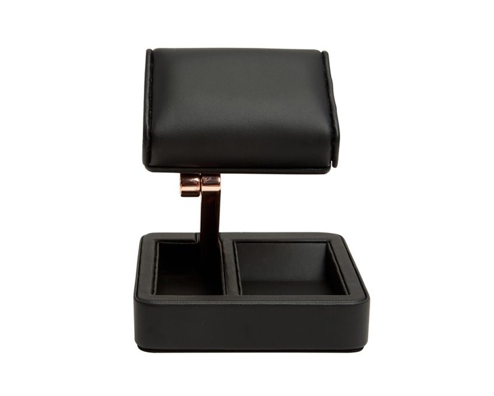 The elegant Wolf Axis 485316 watch stand for one watch is handmade from vegan leather. Boasting a modern and bold design, the stand has a wide soft padded top cushion and a stable base connected to a reinforced steel bar, keeping your watch safe, scratch-free and accessible.