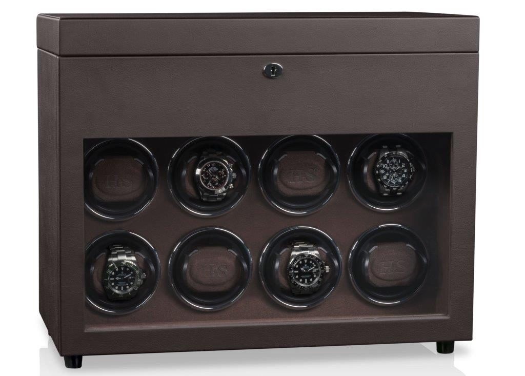 Watch winder Heisse & Söhne Vancouver 8 70019-206.141.141 brown, for 8 pieces of mechanical watches with automatic winding. Under the top lid we find storage space for six more watches. The soft watch pads in the top compartment have chrome-plated guide pins on both sides to prevent the watches from slipping. The winder is covered in brown quality imitation leather with a brown interior.
