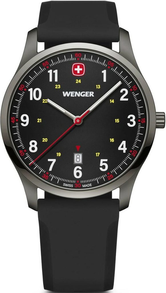 The clear dial is dominated by the red Swiss cross at the 12 o'clock position that Wenger used on its early watch models. Another great feature of this model is the luminescent numerals and hands with Super-LumiNova® treatment. The watch case is made of stainless steel with black PVD finish, the dial is protected by a mineral glass with sapphire crystal. The dial also features a 24-hour time display (military time).