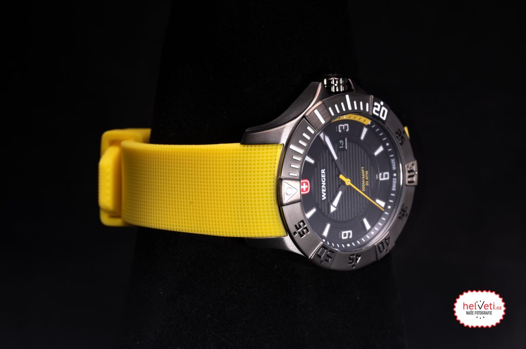 The luminescence of the watch is one of the most striking of the entire Wenger watch range. A thick coating of SuperLuminova is on the indices, hands and the starting point of the rotating lunette. The watch glass is mineral with a sapphire coating. This combines the advantages of hard mineral against breaking/cracking and sapphire against scratching.