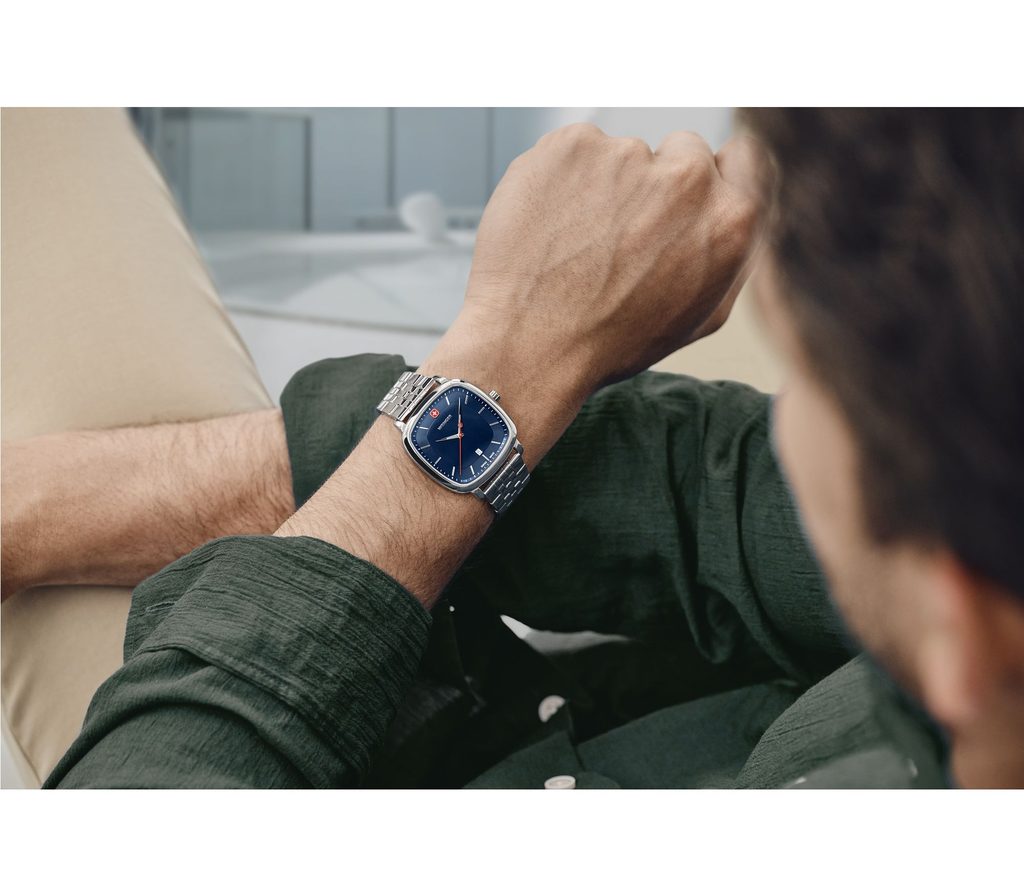 The newly introduced Vintage Classic range features an innovative square-shaped case that uses the same shape as the Wenger logo itself. It features a classic dial with silver indices, and a date window at 6 o'clock.