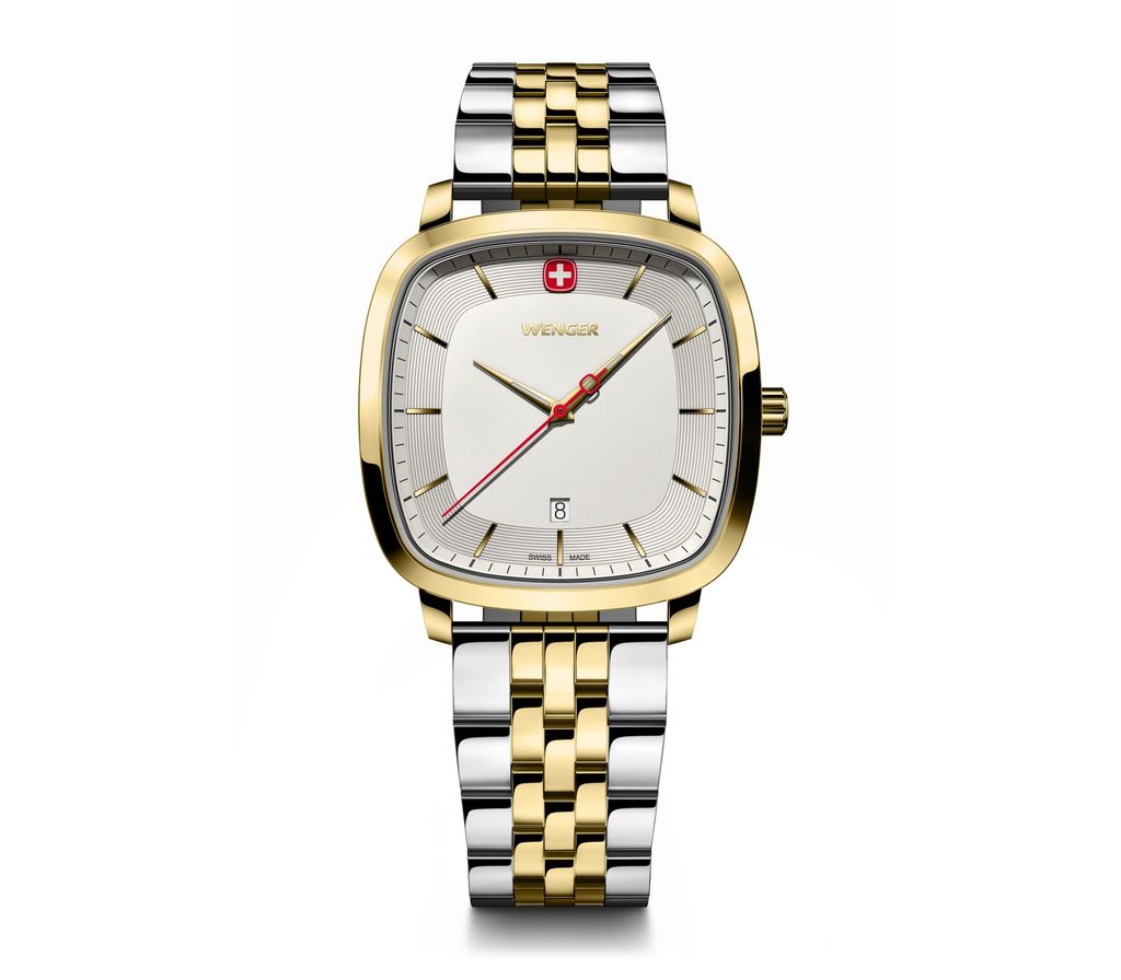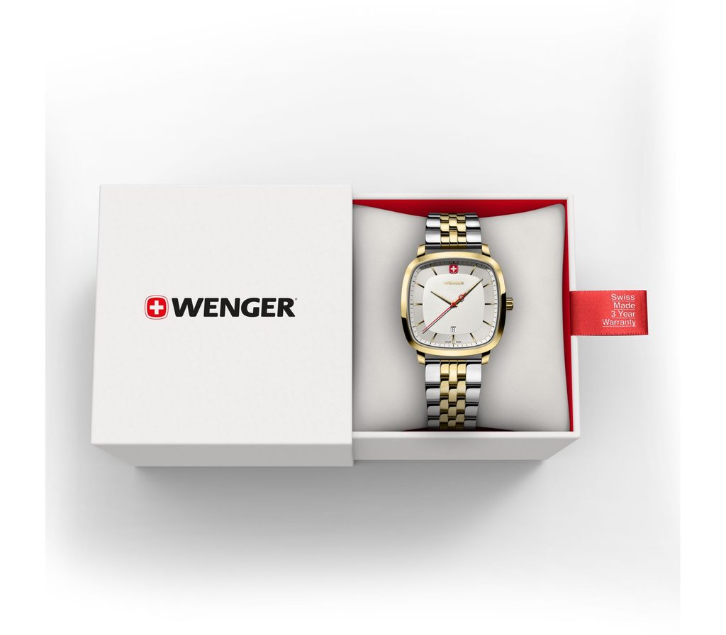 The newly introduced Vintage Classic range features an innovative square-shaped case that uses the same shape as the Wenger logo itself. It features a classic dial with gold indices, and a date window at 6 o'clock.