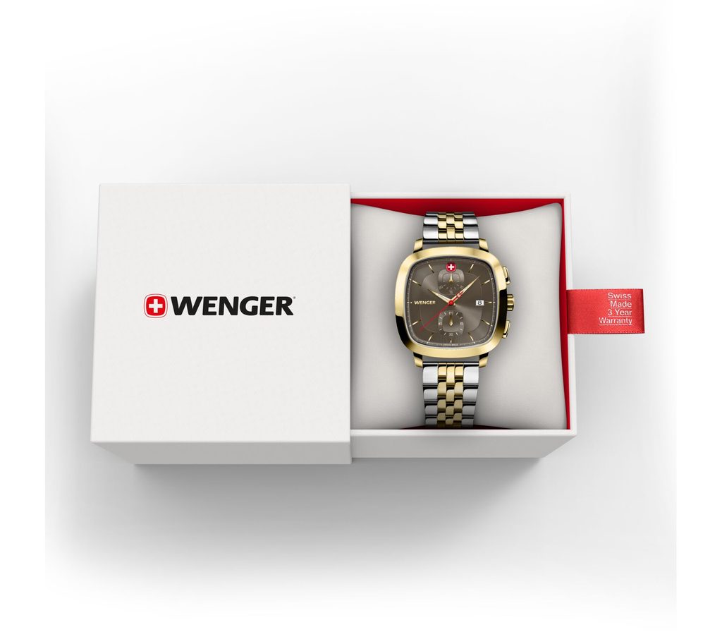 The newly introduced Vintage Classic range features an innovative square-shaped case that uses the same shape as the Wenger logo itself. It features a classic dial with silver indices, and a date window at 3 o'clock.
