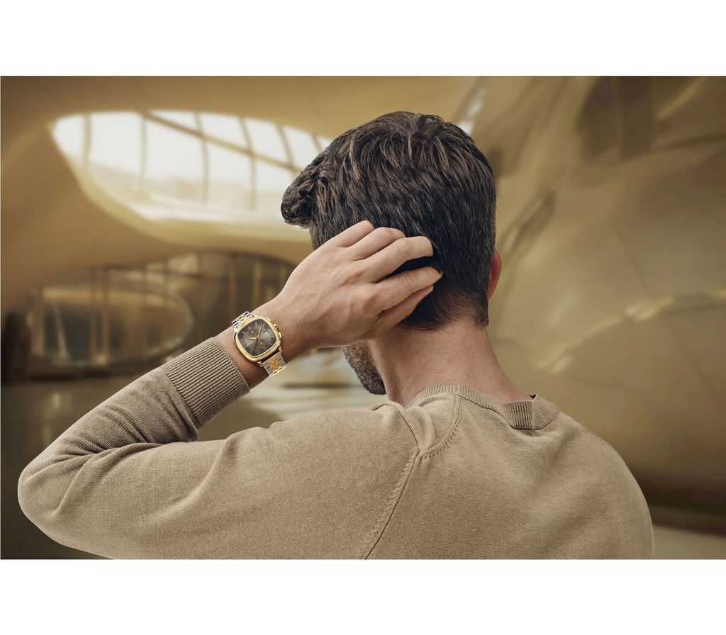 The watch will stay on your wrist thanks to the steel bracelet with PVD finish, which is made of stainless steel. Easy strap changes are ensured by the quick-release fastening system. It is also worth mentioning the signed crown with the Swiss Cross placed classically on the right side of the case. The water resistance of this elegant watch is 5 ATM. Thanks to this waterproofness, the watch can withstand fleeting contact with water, which can be compared to, for example, splashing water, rain, etc.
